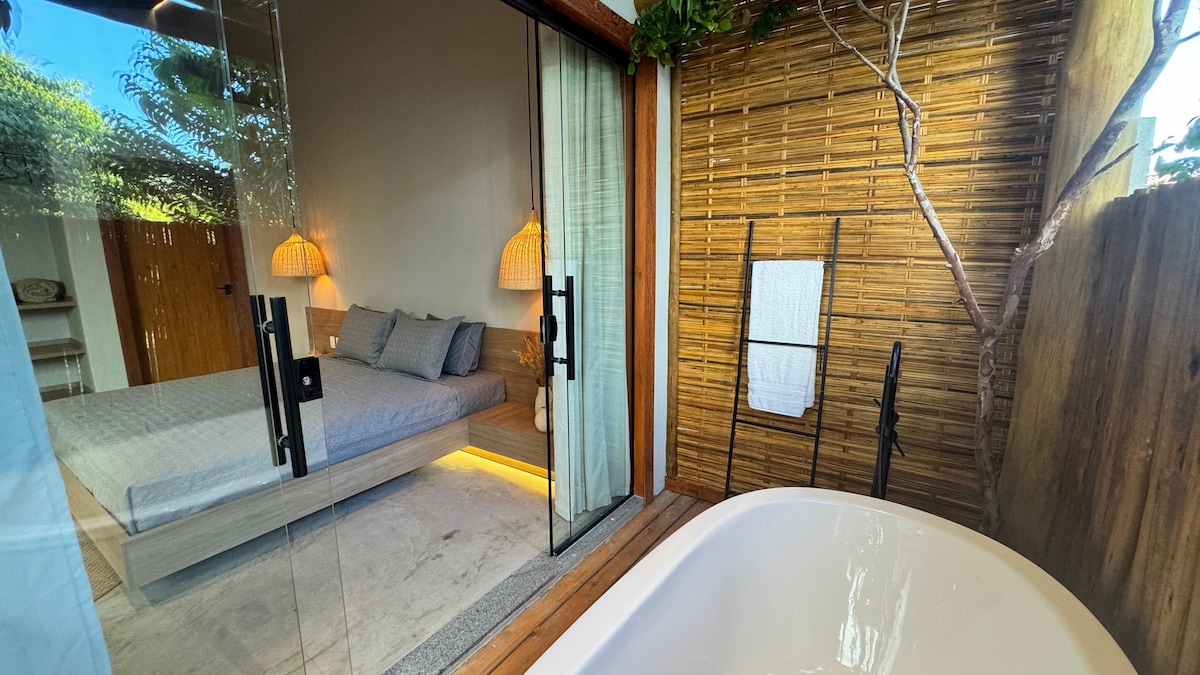 Vila Três • Suíte CÉU @vilatrescaraiva Suíte aconchegante, arejada e espaçosa. Localizada no início do Xandó (Caraíva), em uma Vila, a 150m da praia. Acomoda até 2 pessoas, com 1 quarto com ar condicionado, banheiro privativo, além de área externa relaxante. Possui Wifi e é totalmente equipada. Próxima ao comércio local, a Suíte CÉU combina simplicidade e aconchego em um espaço tranquilo, preparado com amor para você curtir o paraíso! Vem que será um prazer te receber!