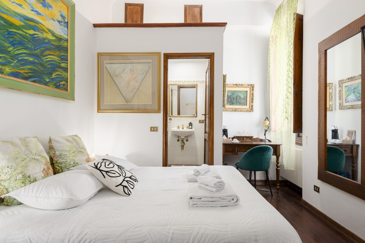 Drom Campuccio is a brand new room of the B & B located in the residence of the owner Claudia and is located in the final part of the beautiful and equipped Court-Garden, shared with other guests, which is accessed from Via dei Serragli. A small entrance with a small table for breakfast, leads into the bedroom and into the private bathroom. Drom Campuccio has a relaxing atmosphere, with its pale green walls and rural paintings that recall the nature in a small field (a small field).
