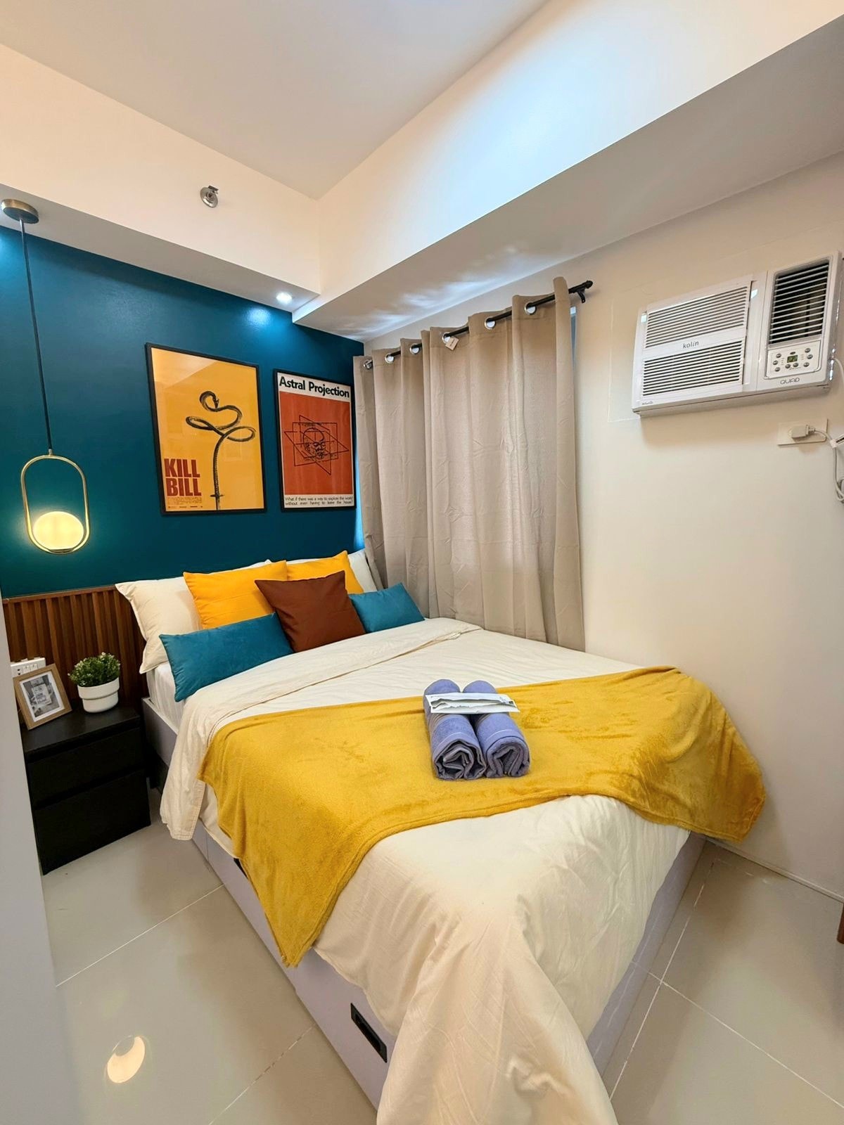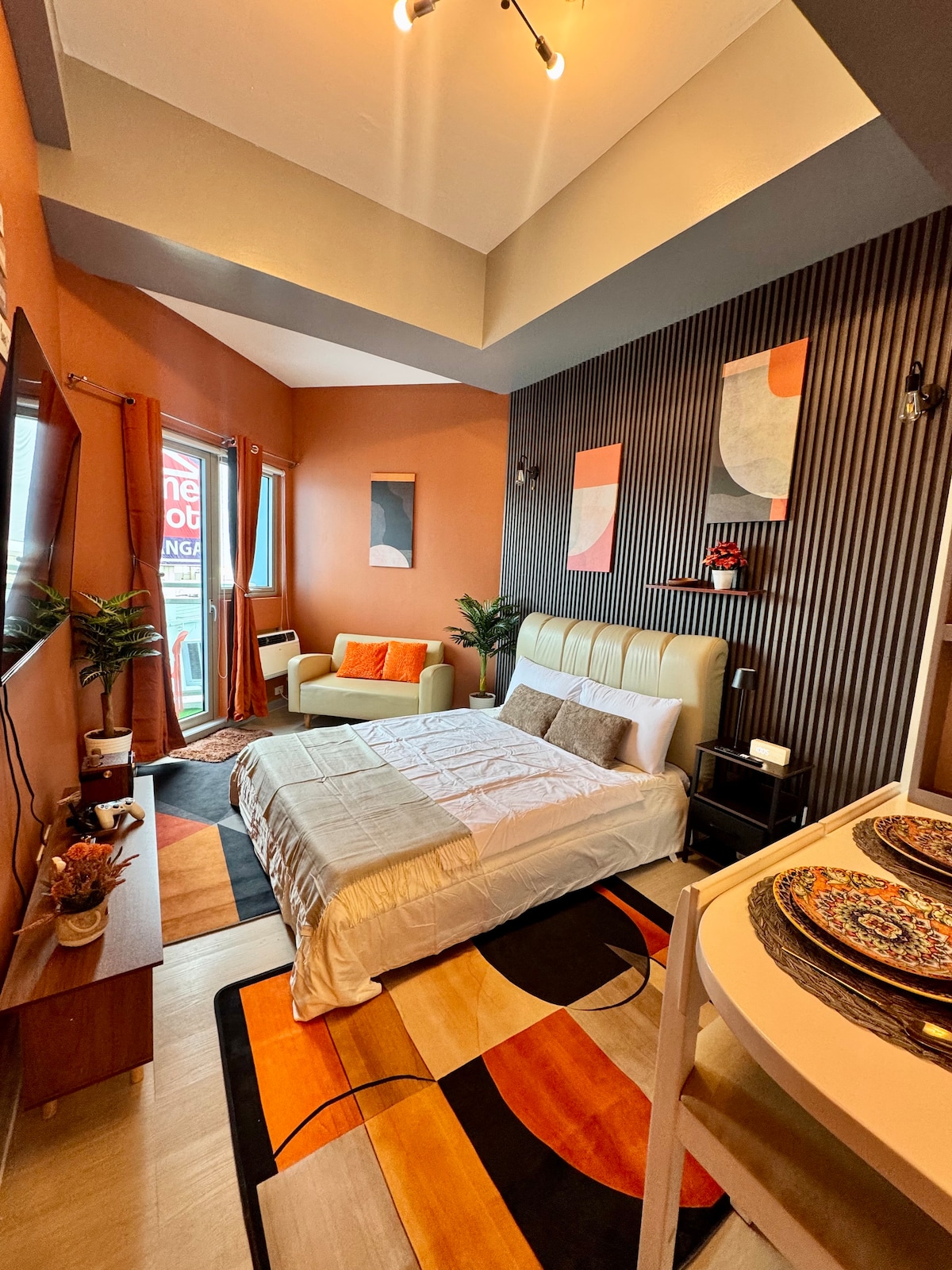 Staycation in Pampanga for only P2500/night 🏝Man-made Beach and wave pool 🌊 ⛰Spacious balcony - Mount Arayat view 🔅Minimalist Interior with extra bed Can accommodate max 4 person Studio unit with extra bed