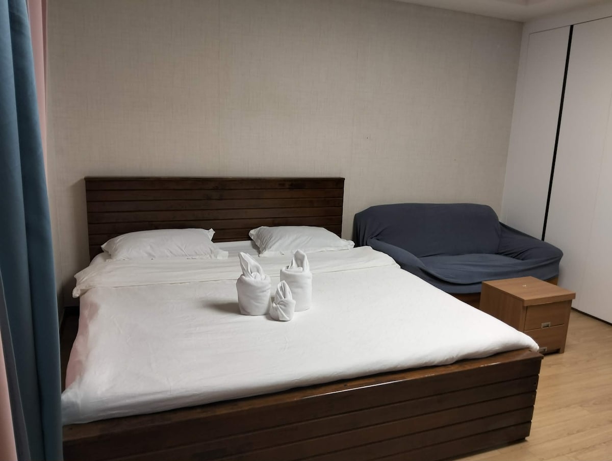 🏠 Everything You Need for a Cozy Stay Living Room: – Comfy lounge chairs – Smart TV with Disney+ access – WiFi – Air-conditioning Dining: – Dining set for meals – Utensils provided – Free filtered water Kitchen: – Induction cooktop – Basic cooking tools – Toaster & kettle – Rice cooker – Refrigerator Bathroom: – Body wash & shampoo – Fresh towels – Hair dryer – Handheld bidet Bedroom: – Cozy double bed – Work desk & chair – Air-conditioning Bonus: – Garment steamer – Free parking