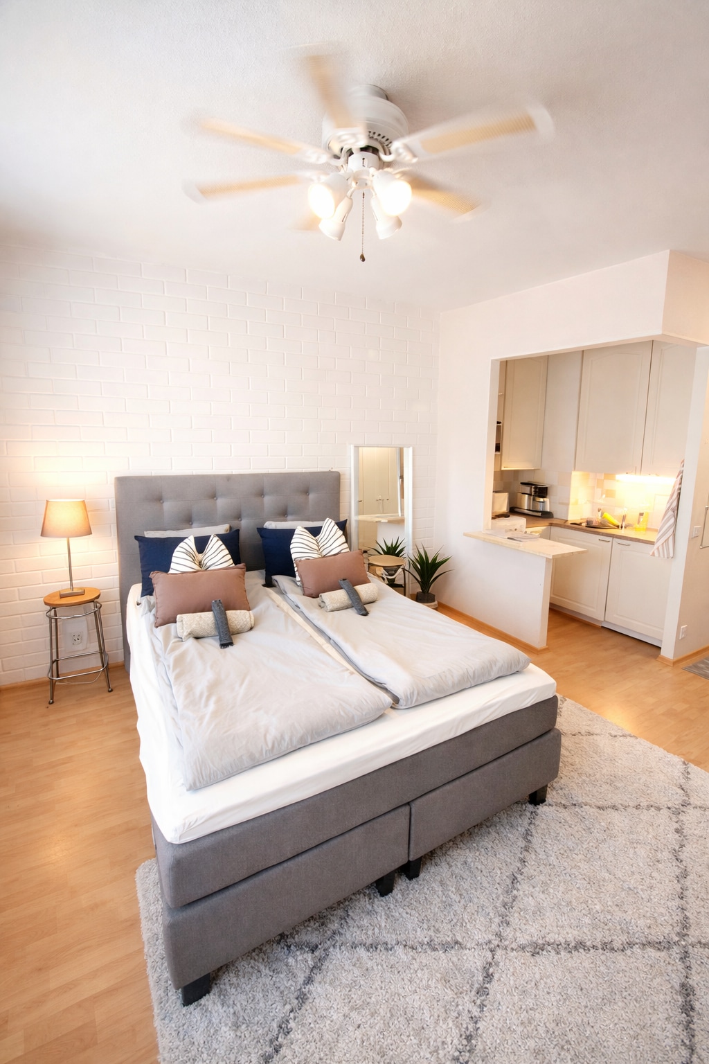 Näppärän kokoisessa pikkuasunnossa on kaikki tarpeellinen. Voit nukkua hyvät yöunet laadukkaassa 120cm leveässä memory-foam sängyssä. Valittavana kaksi eri tyynyä. Kahta matkaajaa varten on vuodesohva jonka voi myös levittää. Siitä tulee tällöin 140cm vuode johon sopii myös nukkumaan 2 henkilöä. Asunnon ulkopuolella pieni viihtyisä terassi-patio jossa voit säiden salliessa paistatella auringossa tai tarpeen tullen avata varjon jolloin on mukavaa istua myös auringon paahtaessa.