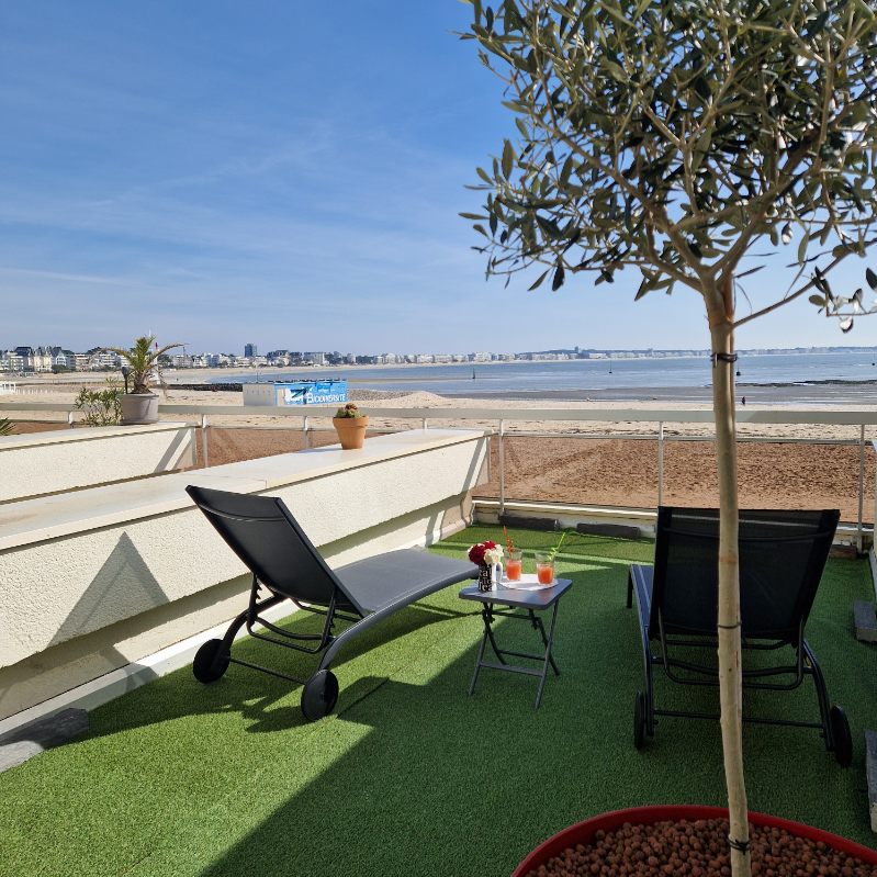 Pornichet: T2 cocooning face mer Appartement de 40 m2 situé au RDC d'une résidence de standing sécurisée, avec terrasse de 11 m2, pouvant accueillir jusqu'à 6 personnes. Le logement comprend 1 chambre avec 1 lit de 160, 1 entrée cabine avec 2 lits superposés et dans le séjour 1 convertible de 140. Salle de bain et WC séparés. Cuisine entièrement équipée. Logement refait à neuf. Emplacement idéal, proche des restaurants, clubs de plage, casino, Thalasso, commerces, marché, etc...