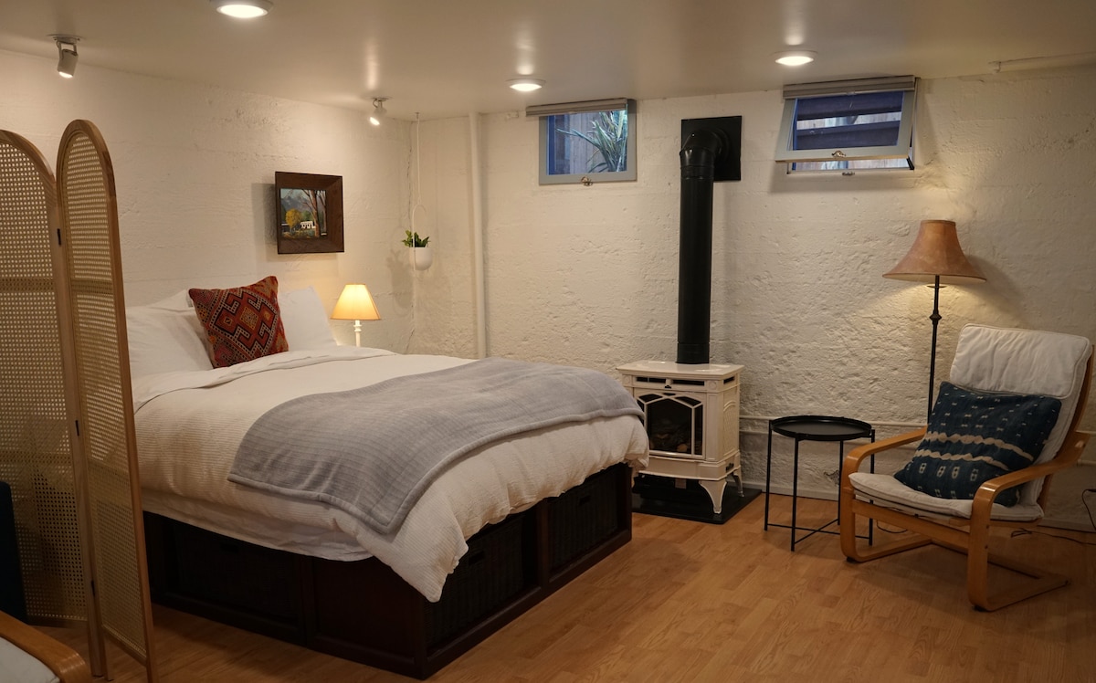 A lovely upstairs guest suite with private patio and entrance. Large room, fireplace and kitchenette with refrigerator,microwave,toaster ,coffee machine. Complimentary coffee juice and muffins to help start your day.explore the area or walk to quiet beach steps away or sip a glass of wine in your garden.Perfect for a quiet getaway Please see Mandalay Shores Quiet Retreat our AirBnB space which is part of our home.