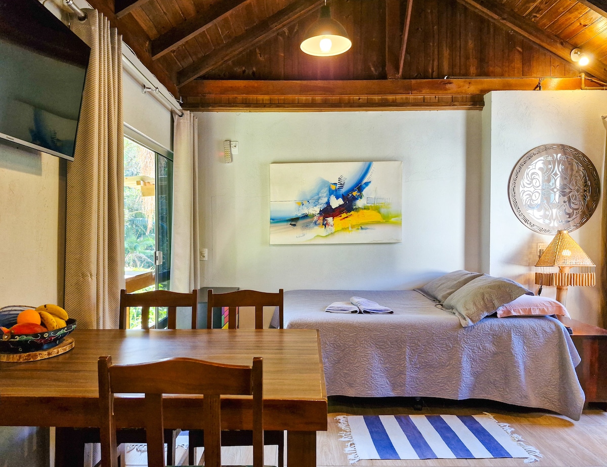 Chalés individuais em pousada com piscina e churrasqueira a 350 m do mar! Privacidade, natureza, jardim exuberante em rua sem saída. Ambiente tranquilo e familiar. Estacionamento e Wifi gratuito. Conforto com chalés equipados para fazer qualquer tipo de refeição. Na área comunitária temos piscina, churrasqueira, fogueira, slackline, playground, espaço de meditação. Temos um Centro de bem estar: Universo Zon com terapias integrativas, yoga, reiki, massagens relaxantes e terapêuticas.