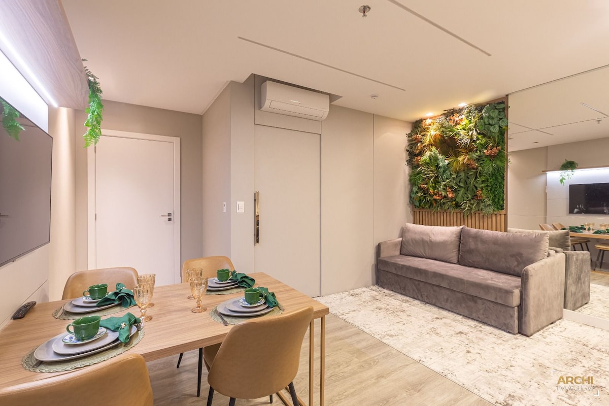 Apartamento completo climatizado, com todas as mobílias e utensílios, em excelente localização (à 3min da praia, próximo a comércio e restaurantes) Equipado com smart tv, máquina lava e seca, ar condicionado em todos os ambiente, fogão por indução e todos os utensílios de cozinha. Uma vaga de garagem e wi-fi Abriga até 5 pessoas: uma cama de casal, uma cama auxiliar e sofá cama Estrutura moderna e novíssima, entregue em Janeiro de 2023. Ambiente tranquilo para suas férias ou viagem à trabalho