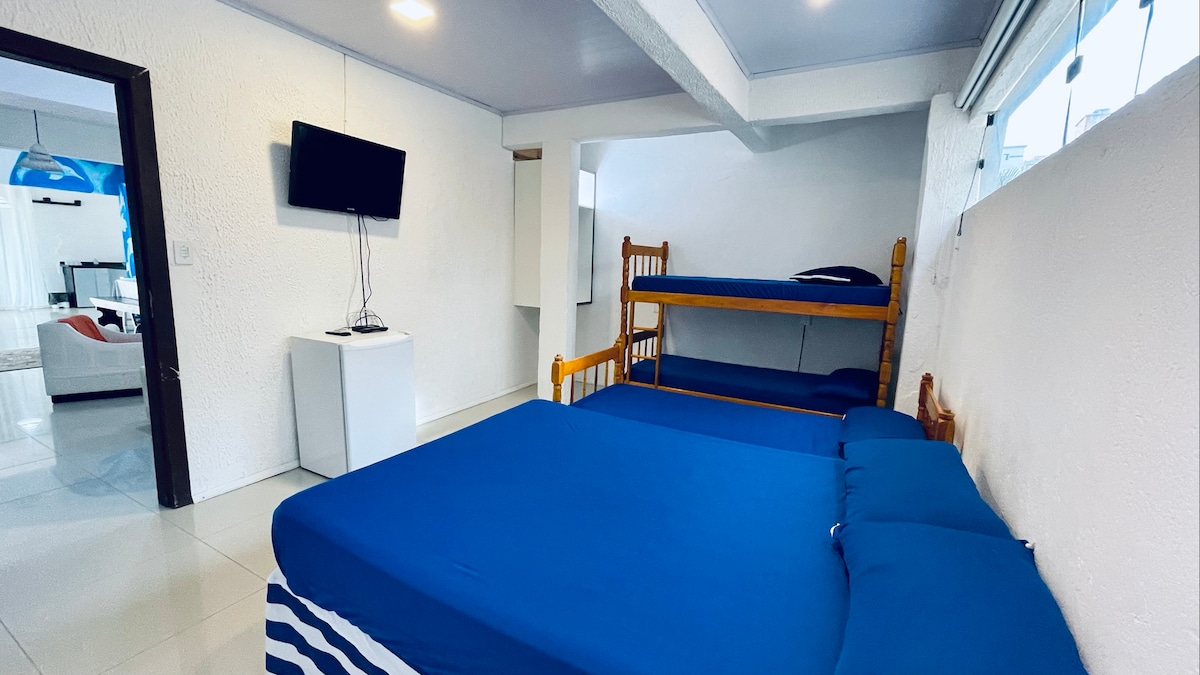 Suíte para duas pessoas cama de casal,contendo ar condicionado,Smart TV 32".Local tranquilo para dormir, pois é em andar alto com vista para o mar. O cômodo privativo é somente a suite,(quarto + banheiro) demais ambientes do apartamento são compartilhados com a anfitriã. O imóvel fica 5 minutos a pé da praia. Em ótima localização, perto de tudo caféterias, bares, restaurantes,supermercados, farmácias e muito mais. Estacionamento privativo dentro do prédio, no 1° andar.
