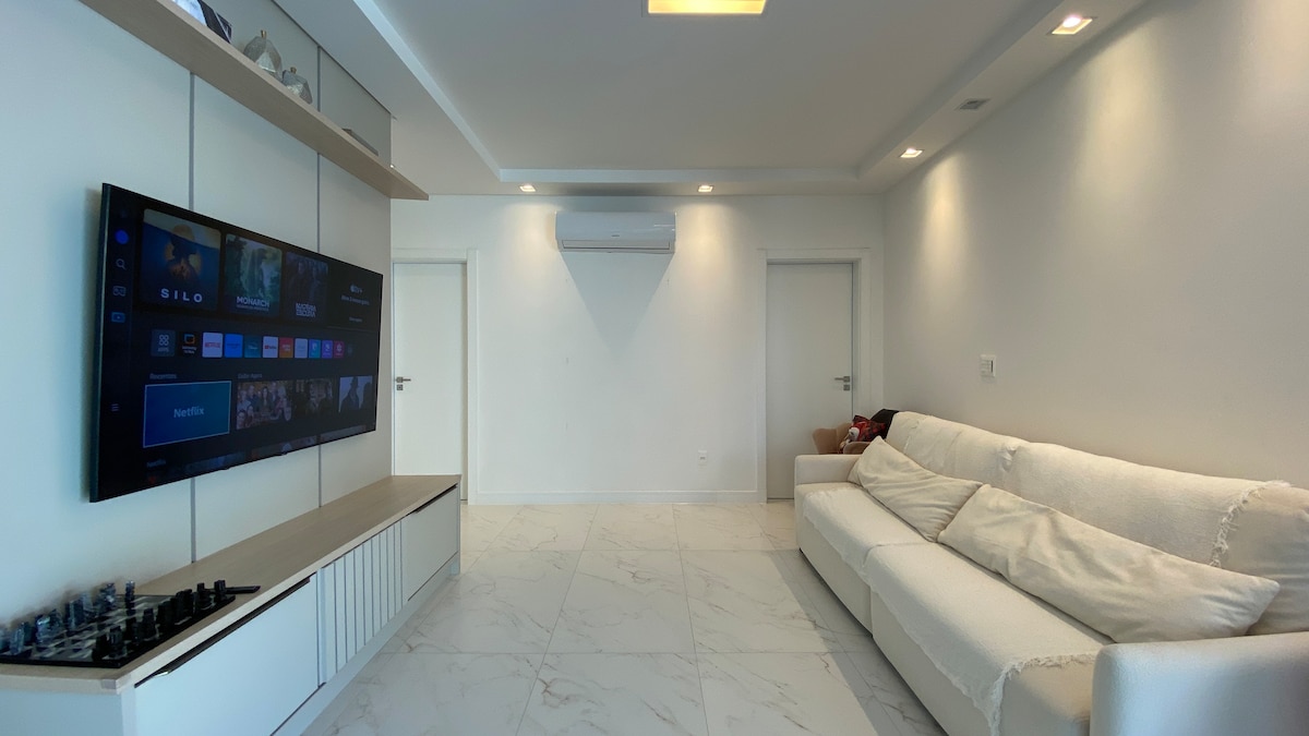 Tenha uma estadia exclusiva neste apartamento de alto padrão, em frente à avenida principal e a poucos passos da praia. Suíte master com vista para o mar, cama king e hidromassagem. Segunda suíte também com vista espetacular. São 3 suítes, mais lavabo, acomodando até 8 hóspedes com colchões extras. Ar-condicionado e Smart TV na sala, além de enxoval completo e cozinha equipada. Duas vagas lado a lado. Próximo a mercados, farmácias, restaurantes, lojas e shopping Russi & Russi. Faça tudo a pé.