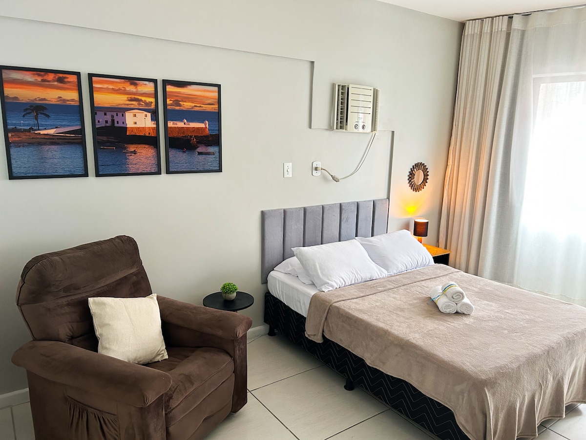 Managed by @Insider.Bahia - Apartment with sea view, a few steps from Farol da Barra beach, with cozy and very elegant decor. Bedroom and living room apartment, with air conditioning, perfect space for the home office with high-speed wi-fi, large and cozy balcony, fully equipped American-style kitchen. Apt has a free parking space. Located close to the "Farol da Barra" fort, beaches, museums, restaurants and bars, the space is an invitation to the beauties of Salvador.