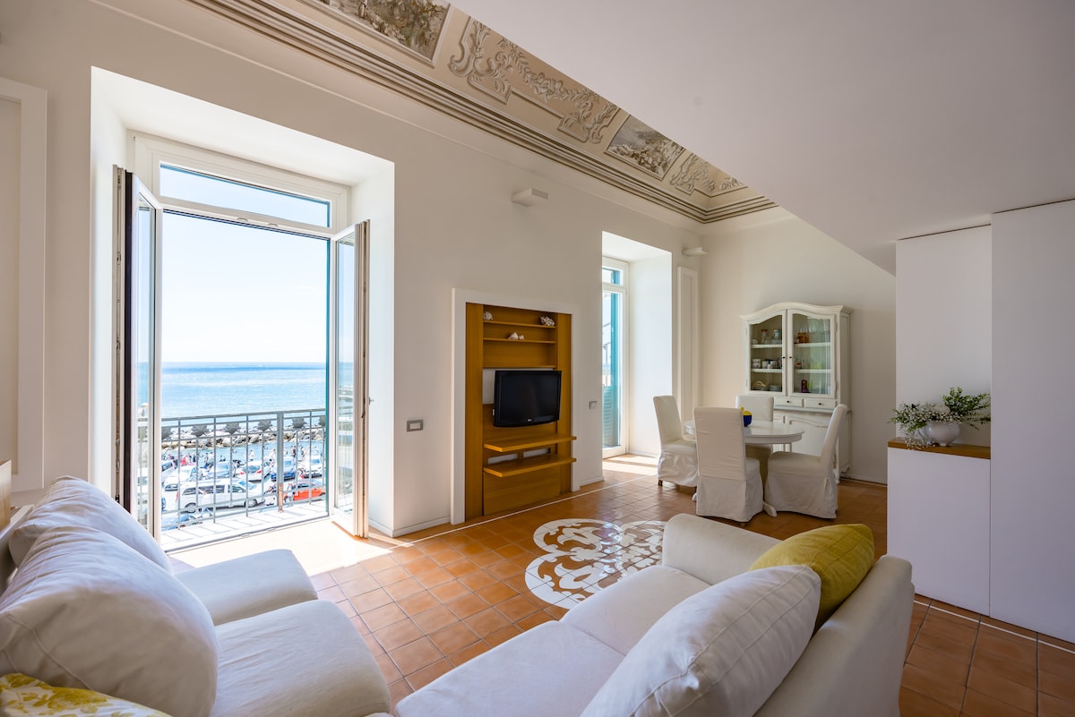Breathtaking panorama. Prestigious building on the seafront. A few steps from Piazza del Plebiscito, Monte Echia, Quartieri Spagnoli, Napoli Sotterranea, San Gregorio Armeno, Cappella San Severo. Seventh floor with elevator. A bedroom, a bathroom, living room with double sofa bed, kitchen, dining area. Balcony overlooking the sea with table. Walking distance hydrofoils/ferry to Capri, Ischia, Procida. VERY CENTRAL and practically ON THE WATER