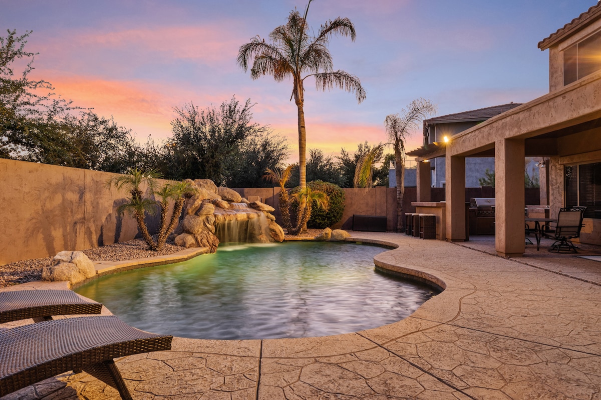 This 5 bedroom home was designed for you to enjoy the Arizona weather. Outside you'll find a heated pool oasis, jungle gym, swing set and in-ground trampoline. At night you can gather around the firepit or have a great family BBQ. More fun awaits inside with a pool table, gas fireplace, and books and games to enjoy. When you need a little time alone all 5 bedrooms have king beds and TVs. There is one full bedroom and bathroom downstairs for easy access.