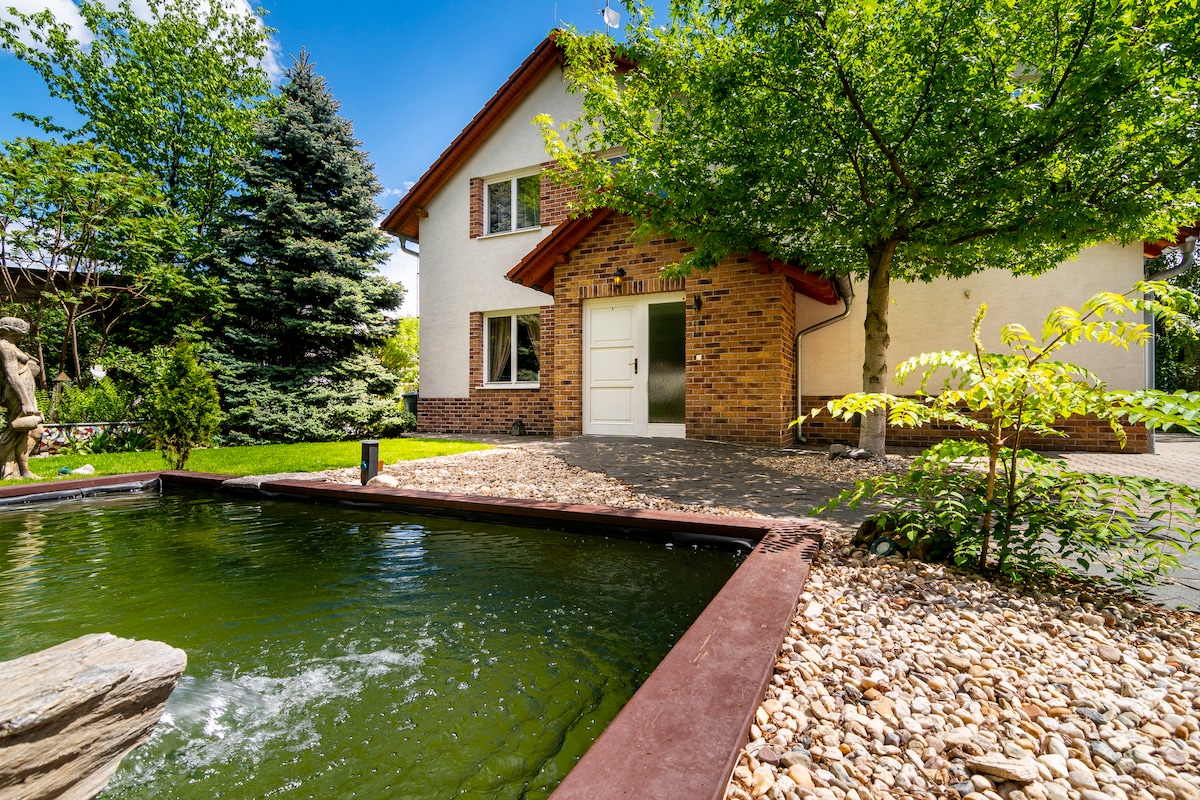 🍀Relaxujte v moderním klimatizovaném domku s terasou s relaxačním nábytkem, luxusní vířivce ( 60 min denně ZDARMA) nebo v bazénu ( jen léto), houpací síti, u ohniště, pod bioklimatickou pergolou s jídelním nábytkem, při grilování v krásné zahradě 1600 m², děti potěší velké dětské hřiště. 🫶 Bazén i zahradu sdílíte s naší rodinou- náš dům i Airbnb domek jsou vedle sebe ❤️ Pro páry, rodiny i psí miláčky Centrum Prahy – 20 min Aquapalace Čestlice – 10 min Westfield Chodov – 20 min Zoo – 35 min