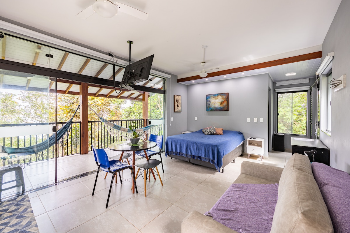 Charmosos estúdios self catering na linda praia do Prumirim. Entrada independente, pátio privado, cozinha totalmente equipada, cama queen size de alta qualidade, sala de estar confortável. Tudo projetado com qualidade, conforto e estilo. Grandes janelas panorâmicas que vão fazer você se sentir entre as copas das árvores! Este é um lugar mágico para quem procura uma fuga romântica à beira-mar conectando-se à natureza sem comprometer seu conforto. Tudo meticulosamente limpo, sanitizado e seguro!