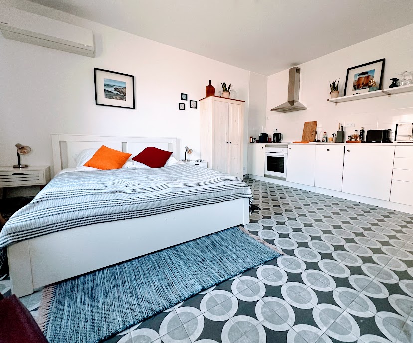 STUDIO T0 (22m2) with equipped private kitchenette, wc and possibility of accommodating one couple (double bed) Possibility of breakfast upon on request Casais Brancos Village Wifi 250mb A/C Private parking Small balcony SharedHeated pool Shared garden Shared exterior kitchen Possibility of having children's bed upon on request Possibility of having breakfast included, upon on request Casais Brancos village This studio belongs to Casa da Aldeia property in the backyard.