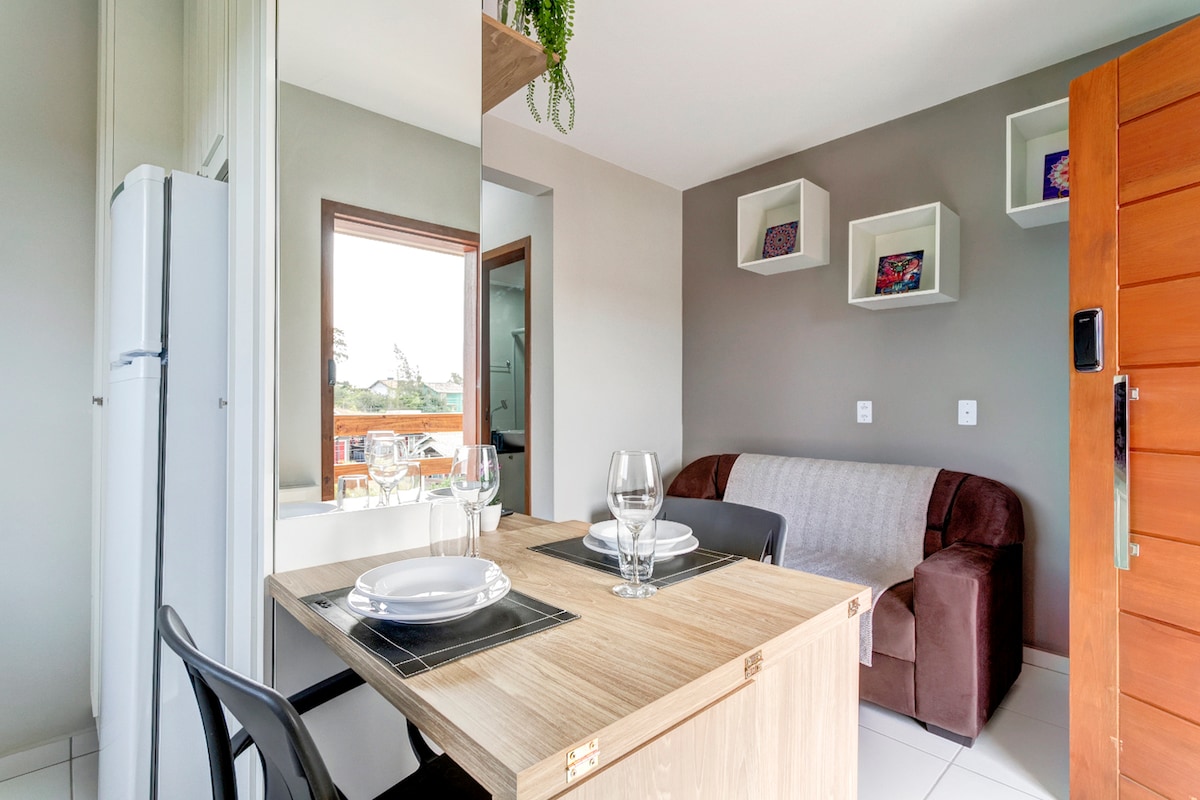 Bem localizado, perto da praia e centrinho, você vai estar perto de tudo na Ferrugem. Trata-se de um AP térreo em lindo sobrado, novo e funcional. Tendo a praia da Barra da lagoa e Ferrugem de fácil acesso. Oferece internet, sala com sofá-cama e TV (Fire Stick), ar condicionado, cozinha completa, churrasqueira, bar, área com tanque, varanda, banheiro com box e dormitório com cama de casal, roupeiro e ventilador de teto. Acomoda 4 pessoas. Tem uma vaga de estacionamento na frente e outra ao lado.