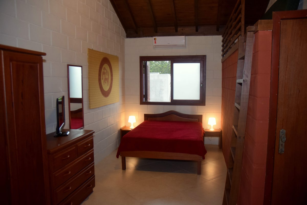 Amplo, confortável, privativo, acesso individual Ideal p/ casal jovem ou 4 pessoas, de bem com a vida 5 minutos da praia de carro (2 km); 1km do centrinho. Local tranquilo, seguro, fácil acesso ao Rosa e outras praias da região. -Quarto com cama box queen e Ar Condicionado Q e F -Sala com TV 32 Smart, bicama p/ 2 solteiros, ventilador -Varanda deliciosa com rede e linda vista para montanhas -Cozinha completa e funcional -Jardim e churrasqueira (uso comum) - Wi-fi estável fibra 100mb