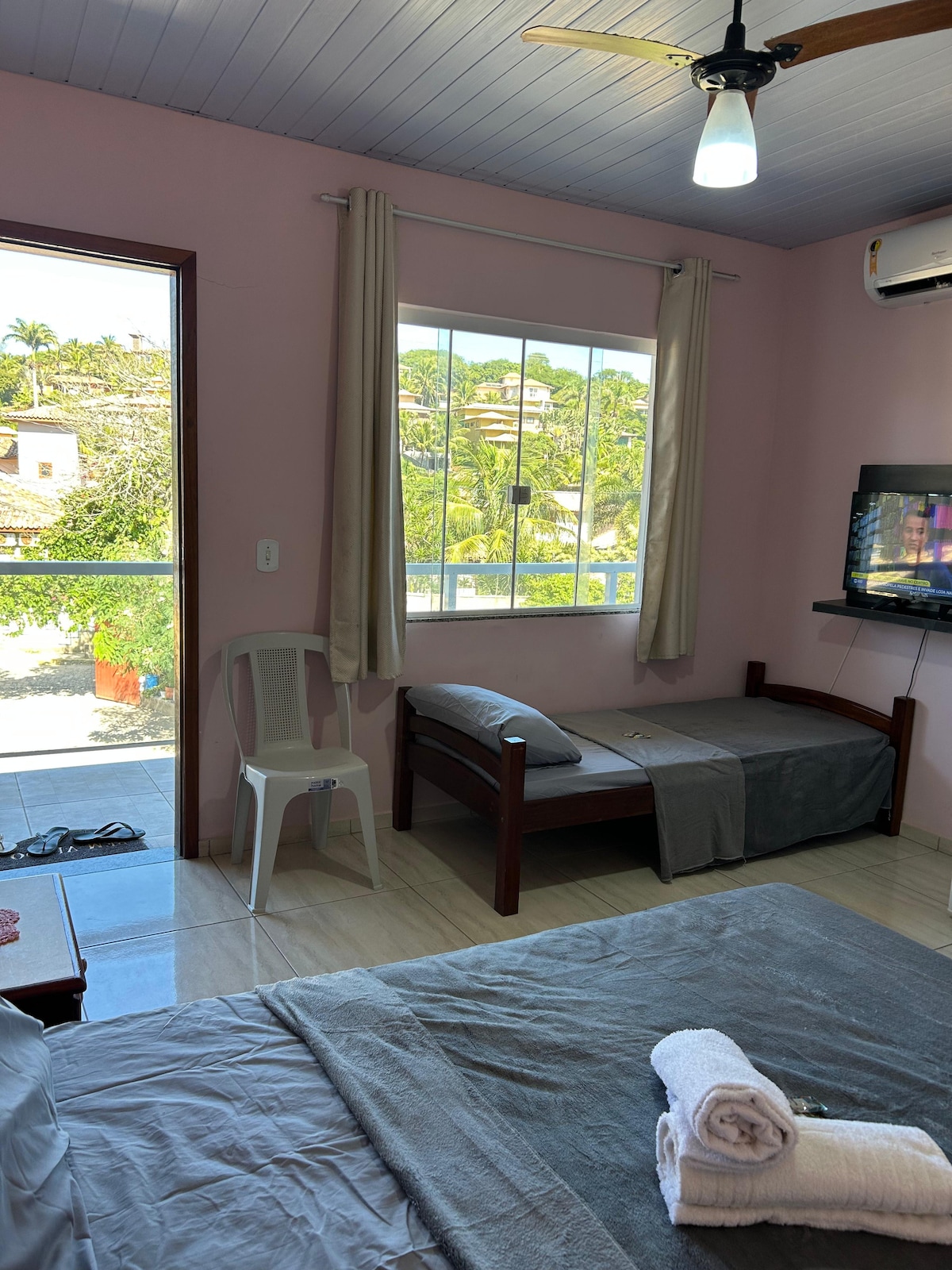 localizado no final da orla bardor na praia da armação, há 50 metros da praia dos ossos, há 120 metros da praia da azeda, há 500 metros da praia de João Fernandes e há 500 metros da rua das pedras onde fica os melhores restaurantes, bares e boates, a suíte fica de frente para a praia da armação você dorme com vista para a o mar, ao sair no portão você já está na praia, a suíte é equipada com cama king, ventilador de teto, ar condicionado tv fogão e geladeira!!!