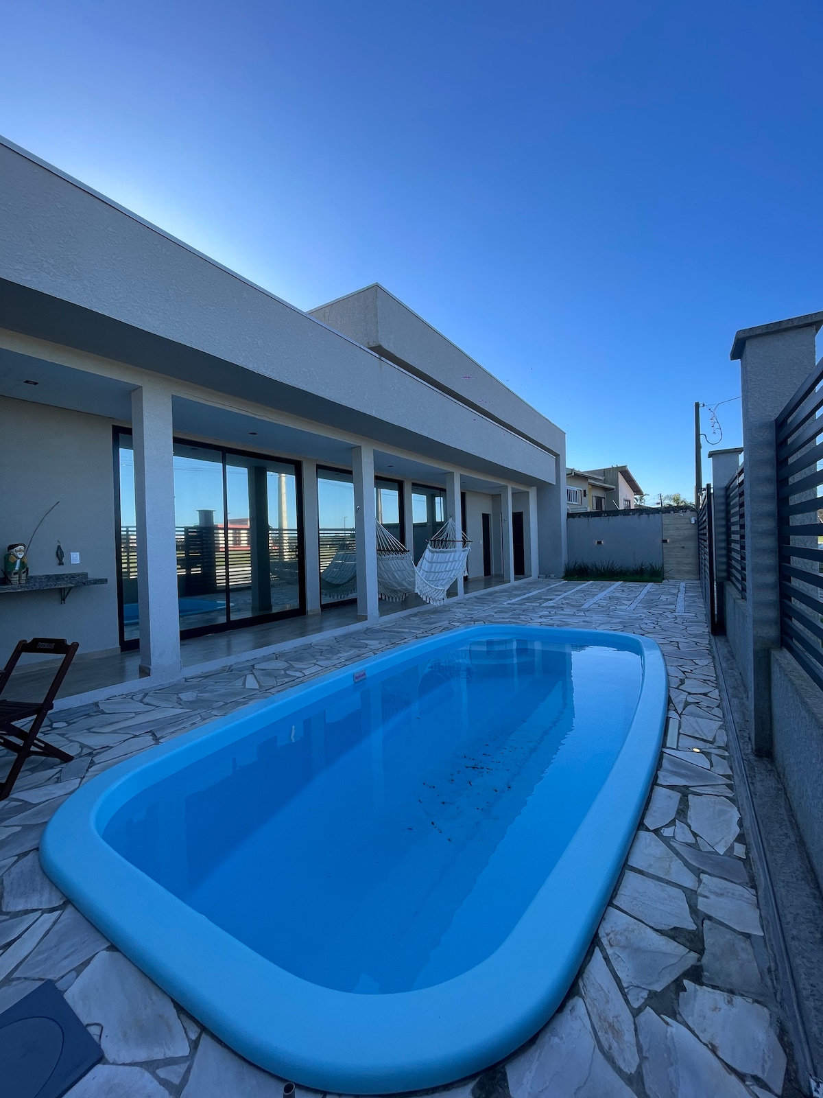 Relaxe com toda a sua família em uma casa nova charmosa e aconchegante. A estrutura é moderna e projetada, piscina com aquecimento solar, área de lazer espaçosa, churrasqueira equipada, quartos com ar-condicionados Daikin acionados via wi-fi, torneiras e chuveiros aquecidos a gás, alarme monitorado 24 horas e câmeras externas. Disponibilizamos carrinho de praia, cadeiras, guarda sol. Desfrute bons momentos. 7 min do embarque para a Ilha do mel.