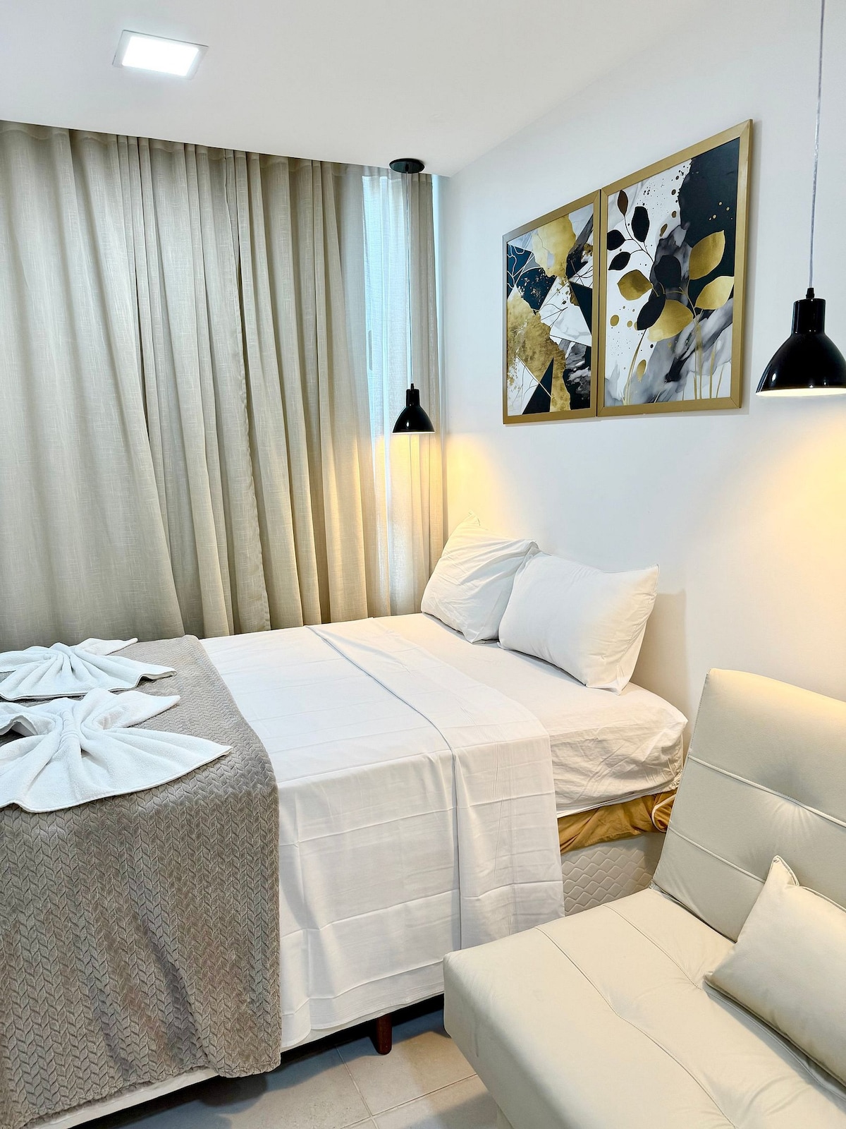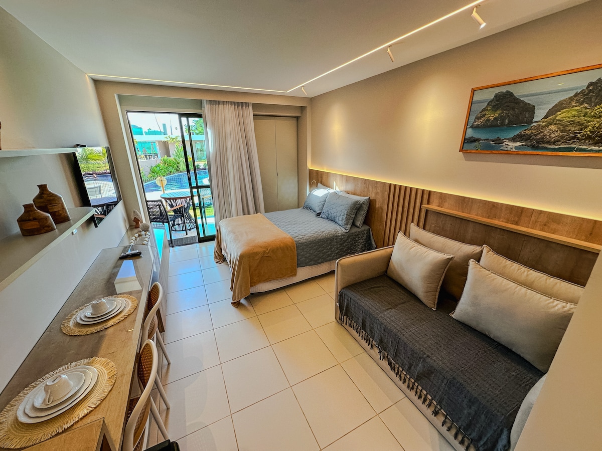 Studio no Marulhos Suites Resort. Cama queen, bicama, colchão extra, ar condicionado, internet boa e smart tv. A cozinha conta com geladeira, Gelágua, cafeteira, sanduicheira e os demais utensílios de cozinha. Apto aconchegante de frente para as piscinas. O hotel é de primeira, conta com várias piscinas, sauna, academia, campos de futebol e tênis, área de jogos e recreação todos os dias para a criançada. Ja tenho alguns anos alugando esse e outros flats em muro alto, então pode confiar!