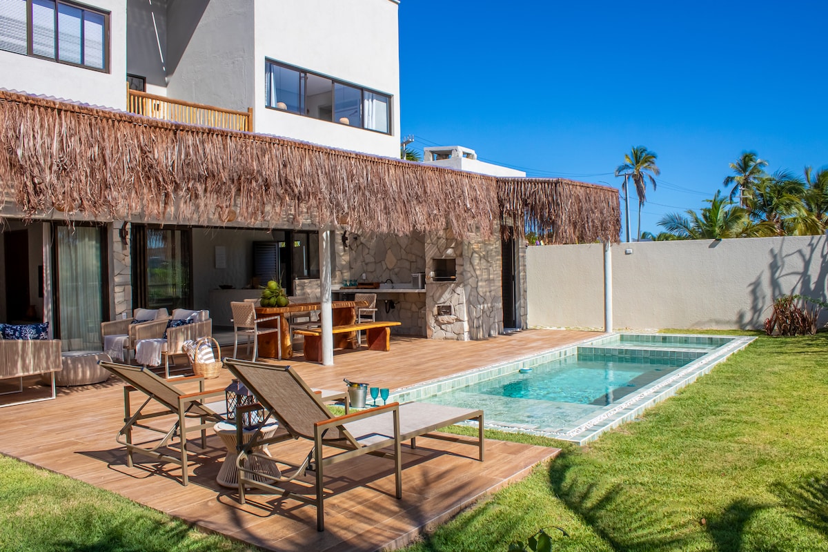 • Prime Location: Close to the beach and the Chapel of Milagres. • Exclusive Highlights: Private rooftop pool and barbecue area. • Complete Accommodations: 3 en-suite bedrooms with air conditioning. • Indoor Spaces: Comfortable living room and fully equipped kitchen. • Internet: High-speed Wi-Fi. • Outdoor Spaces: Spacious terrace with a hammock and views of the coconut groves, perfect for relaxing. • Security: Private Condominium with 24-hour security.