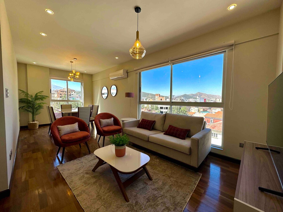 Enjoy a stylish experience at this centrally-located place. Our apartment is beautifully decorated with costume handmade furniture made in Bolivia. Located in the best area in Cochabamba surrounded by parks and a stunning view of the mountains and the Cristo. Walking distances to coffee shop, wellness yoga center, saturday local fresh markets, restaurants, public transportation, university, and so much more.