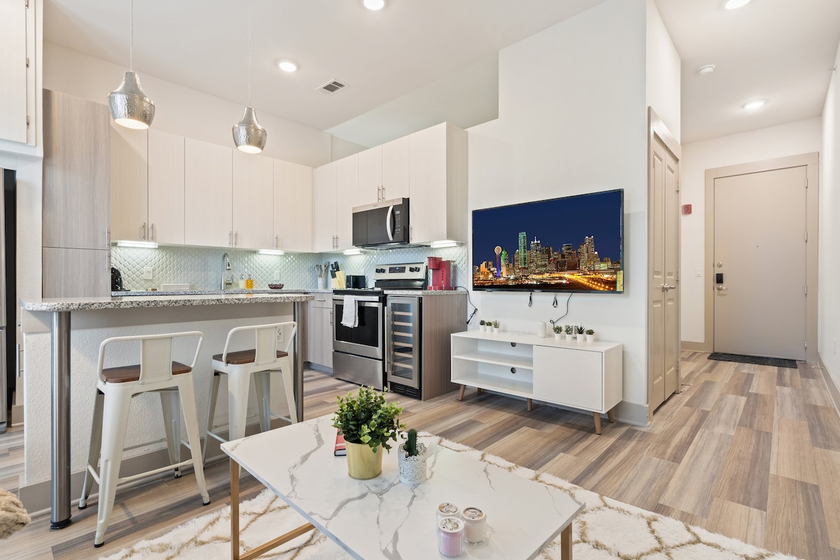 Less than two miles from Downtown Dallas, the Victory Park neighborhood sits between the Design District and Uptown. Our apartment is designed to help you do your best thinking. Featuring bright expansive spaces and complimentary WIFI, you’ll have everything you need to be your most productive. Relax & Rejuvenate When your day is done, in a space that is created for unwinding in every way. 24/7 Suite Support If you have any questions or concerns throughout your stay.