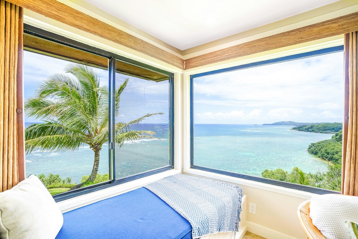 This modern and newly renovated honeymoon beach retreat has breathtaking panoramic ocean and coastline views. Lounge in the daybed while gazing at the sweeping vista from Anini reef to Kilauea Lighthouse. Some have said "it feels like being on a ship at sea" as they witness whales breaching in the ocean and waves peeling on the reef from this magical location. A rare penthouse unit with high ceilings, views from every room, even the famous Bali Hai from the deck. Truly a couple's dream!