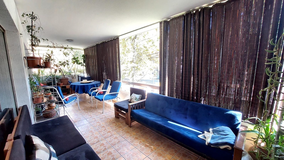 Beautifully restored 1.000 ft2 house from 1936 with private garden of 900 ft2 with two terraces, lovely art and antique collection. The house is located in a quiet residential area, but a few blocks away from the well-known neighborhood of Barrio Italia, a vibrant commercial area, full of restaurants, fashion stores and antique shops. 10 minutes walking distance from the subway (Santa Isabel, Line 5), 2 minutes away from the nearest bus station, and 25 min cab ride from the airport.