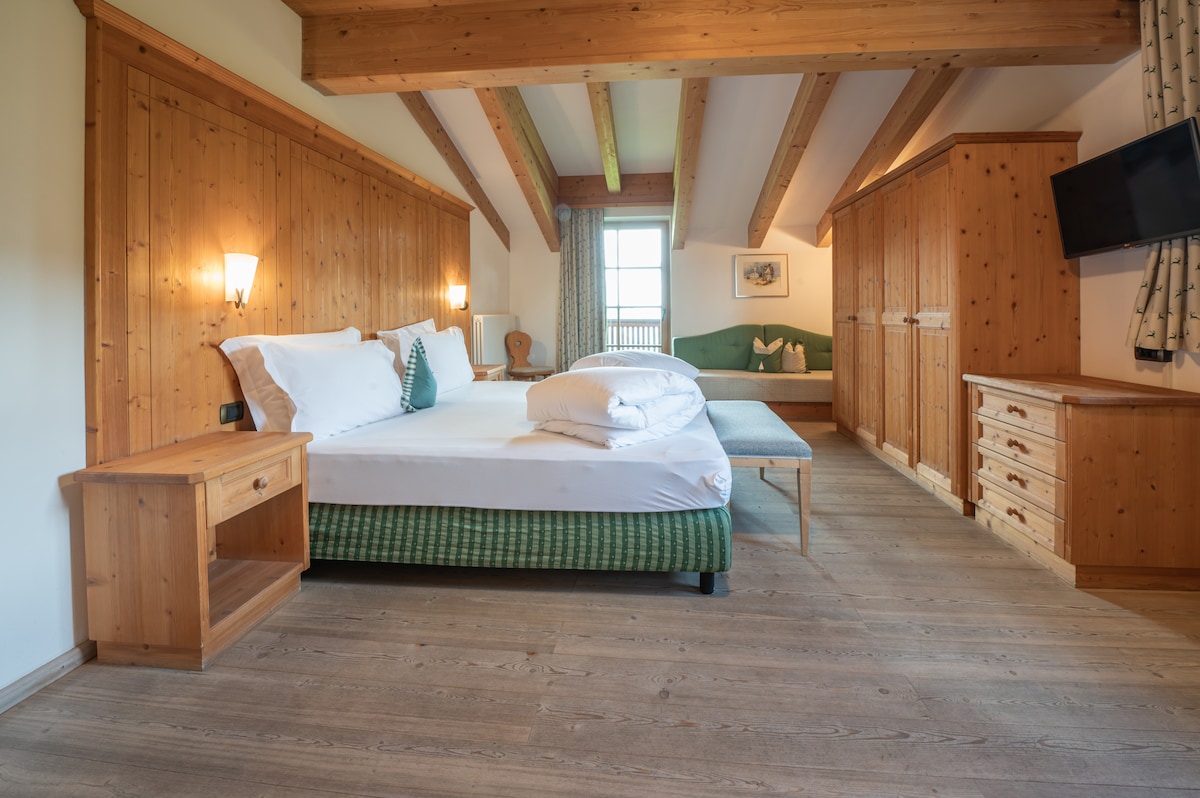 Accogliente camera matrimoniale di circa 23 m². Il legno di pino cembro (cirmolo) rende questa stanza prestigiosa grazie al suo eccezionale profumo e alle proprietà olfattive e calmanti. Una sistemazione ideale per le coppie che vogliono godersi qualche giorno di relax o un weekend romantico tra le Dolomiti.