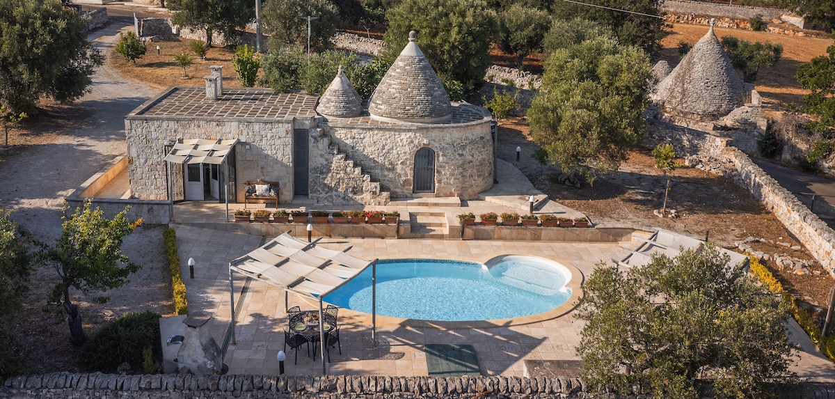 The Trullo Apulia is an exclusive property, made by recovering an original ancient historic domed house (called "Trullo Saraceno"), enriched by swimming pool, Jacuzzi and steam room for private use, in a scenic location, just 2 km from Ostuni and 10 km from the beautiful beaches of Puglia. It can accommodate up to 8 people. Note: the reservation fee does not include consumptions of electricity (0.50€/kWh), gas (5€/m3) and the tourist tax (1€/day for each person for the first 5 days) that will be calculated and paid at the end of your stay. Struttura esclusiva con piscina, idromassaggio, bagno turco, 8 posti letto, posizione panoramica, a 2 km da Ostuni e 10 km dal mare. Nota: i costi di consumi elettrici, gas e tassa di soggiorno non sono inclusi nella fee di affitto e dovranno essere calcolati e pagati alla fine del soggiorno. Italian Version Il Trullo Saraceno Apulia è una struttura esclusiva con piscina ad uso privato, in posizione collinare panoramica, a soli 2 km da Ostuni e 10 km dalle splendide spiagge pugliesi. Dispone di 2/3 Camere da letto matrimoniali, 4 bagni (di cui uno con bagno turco, vasca idromassaggio e doccia emozionale), 2 zone living (con 2 divani letto matrimoniali), 2 cucine, 2 camini e può comodamente ospitare fino a 8 posti letto. Atmosfera unica che unisce l’inconfondibile stile mediterraneo ai comfort più moderni, per un soggiorno esclusivo ed originale, all’insegna di relax, privacy e benessere naturale. La struttura è costituita da 2 unità abitative (trullo saraceno con 3 coni + lamia) totalmente indipendenti, ma comunicanti tra loro, separate da una porta con serratura. Ciascuna unità comprende una sala da pranzo con camino, TV a led satellitare e divano-letto matrimoniale, un cucinino completo di elettrodomestici (frigo-freezer, forno elettrico, lavastoviglie, lavatrice, piccoli elettrodomestici)e una camera da letto con bagno privato, completo di doccia emozionale per cromoterapia. Ideale per 2 famiglie di amici che, fatta salva la privacy, possono godere di momenti comuni di relax e divertimento, può anche essere utilizzata come unica unità abitativa, utilizzando una delle due zone living come terza camera da letto matrimoniale. Tutti gli ambienti della casa sono climatizzati e dispongono di connessione internet WiFi. Gli ospiti hanno a disposizione un parcheggio privato. L’intera struttura ha una capacità ricettiva massima di 8 posti letto, mettendo a disposizione dei suoi ospiti ben 4 bagni, di cui 2 interni completi, un’area benessere con bagno turco, aromaterapia, ampia vasca idromassaggio (che si affaccia su una suggestiva parete rocciosa), doccia emozionale con cromoterapia e servizi igienici ed 1 bagno esterno (water+lavandino) con doccia. L’esclusiva piscina a sfioro di acqua salata con idromassaggio è immersa nel verde della macchia mediterranea. Questa oasi di privacy e di relax dispone di tutto il necessario, inclusa una Zona solarium, la doccia esterna ed il bagno di pertinenza. La profondità dell’acqua della piscina risponde ai requisiti di legge per garantire la massima sicurezza anche dei più piccoli. Molteplici sono gli spazi esterni arredati e le ambientazioni minimal chic che consentono agli ospiti di pranzare o cenare su un ampia terrazza panoramica ombreggiata da un gazebo cannucciato o di gustare, appena svegli, una ricca prima colazione all’aperto, in un’area attrezzata proprio davanti alla portafinestra della propria camera da letto, respirando i profumi dei campi, nell’intimità della luce del primo mattino. Al tramonto, l’unicità del trullo e del giardino circostante, vengono ancor più esaltati dall’illuminazione serale, che vi regalerà nuove emozioni ed un fascino indimenticabile, rallegrati dai sapori inconfondibili dei cibi grigliati al barbecue. Il complesso abitativo è frutto di una recentissima ristrutturazione di costruzioni dal valore storico (il Trullo Saraceno dalla caratteristica cupola bianca è ancora più antico del trullo a cono), in cui il sapiente recupero dei materiali, delle tecniche e dei canoni tipici dell’architettura e della storia pugliese, hanno consentito un restauro di interni ed esterni che mantenesse una linea fortemente evocativa e rispettosa dei luoghi, anche nell’arredamento dai colori chiari e naturali, studiati con la massima attenzione ai dettagli e costituito da pezzi unici e originali. Il fascino della location non conosce paragoni: la costruzione si affaccia su un giardino terrazzato caratterizzato dai tipici muretti a secco, oltre i quali si apre, a perdita d’occhio, su un’area di circa 6.000 mq di pertinenza esclusiva della casa, una valle di magnifici ulivi secolari su terra rossa. Un agrumeto, un frutteto, ampie aree di macchia mediterranea tra le quali trovano spazio molte piante ed erbe aromatiche, dischiudono immagini, in un tripudio di colori e profumi di natura incontaminata che illuminano gli occhi ed allietano la mente. l frutti e gli ortaggi tipici pugliesi, totalmente biologici, sono a disposizione degli ospiti. NOTA: Trullo Apulia promuove un uso sostenibile dell'energia elettrica e dell'acqua (presenti pannelli fotovoltaici e per riscaldare l'acqua sanitaria) e ci piacerebbe che anche i nostri ospiti facessero lo stesso. Per questo motivo non includiamo i consumi elettrici in maniera forfettaria nelle spese di affitto ma saranno conteggiati secondo il consumo effettivo che verificheremo insieme, confidando in un vostro uso responsabile (per il dettaglio, vedi la sezione "Altre cose da considerare"). English Version The Trullo Saraceno Apulia is an exclusive property with swimming pool for private use, in a scenic hillside location, just 2 km from Ostuni and 10 km from the beautiful beaches of Puglia. It has 2/3 Double bedrooms, 4 bathrooms (one with a steam room, whirlpool bath and emotional shower), 2 living areas (with 2 sofas bed for 4 people), 2 kitchens, 2 fireplaces. The whole structure can comfortably accommodate up to 8