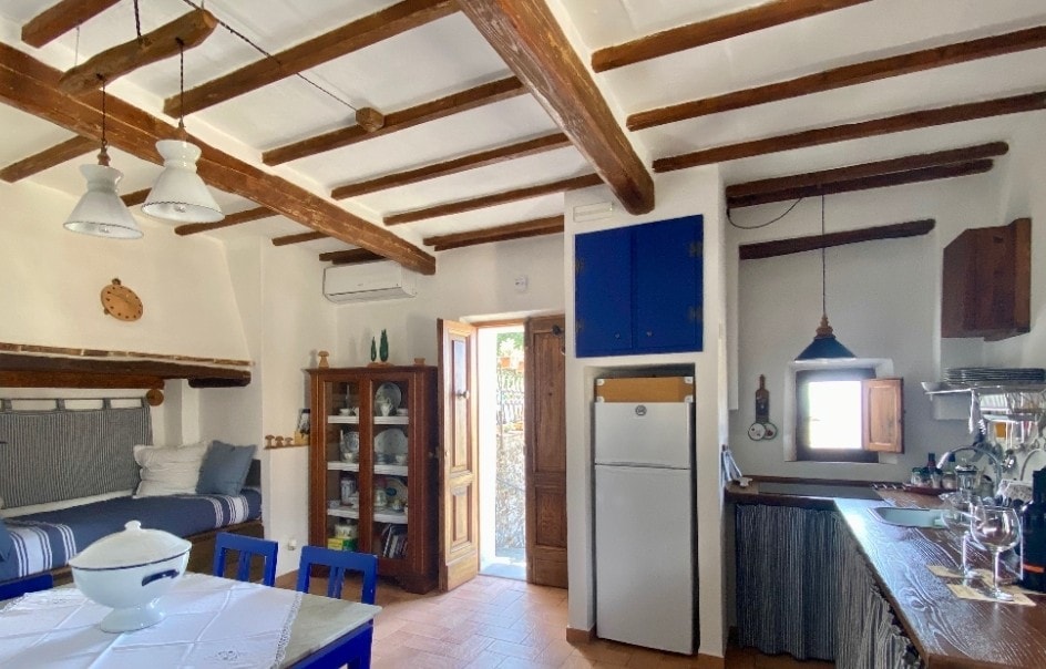 The house is completely redecorated and warmly furnished. It is organized on three levels: on the first floor the living room with the fireplace and the kitchen area, on the second floor the double room and a smaller room with a bathroom .On the ground floor there is a room en suite and a kitchenette. This room is separated from the rest of the house. It is necessary to go outside in the street to reach it.