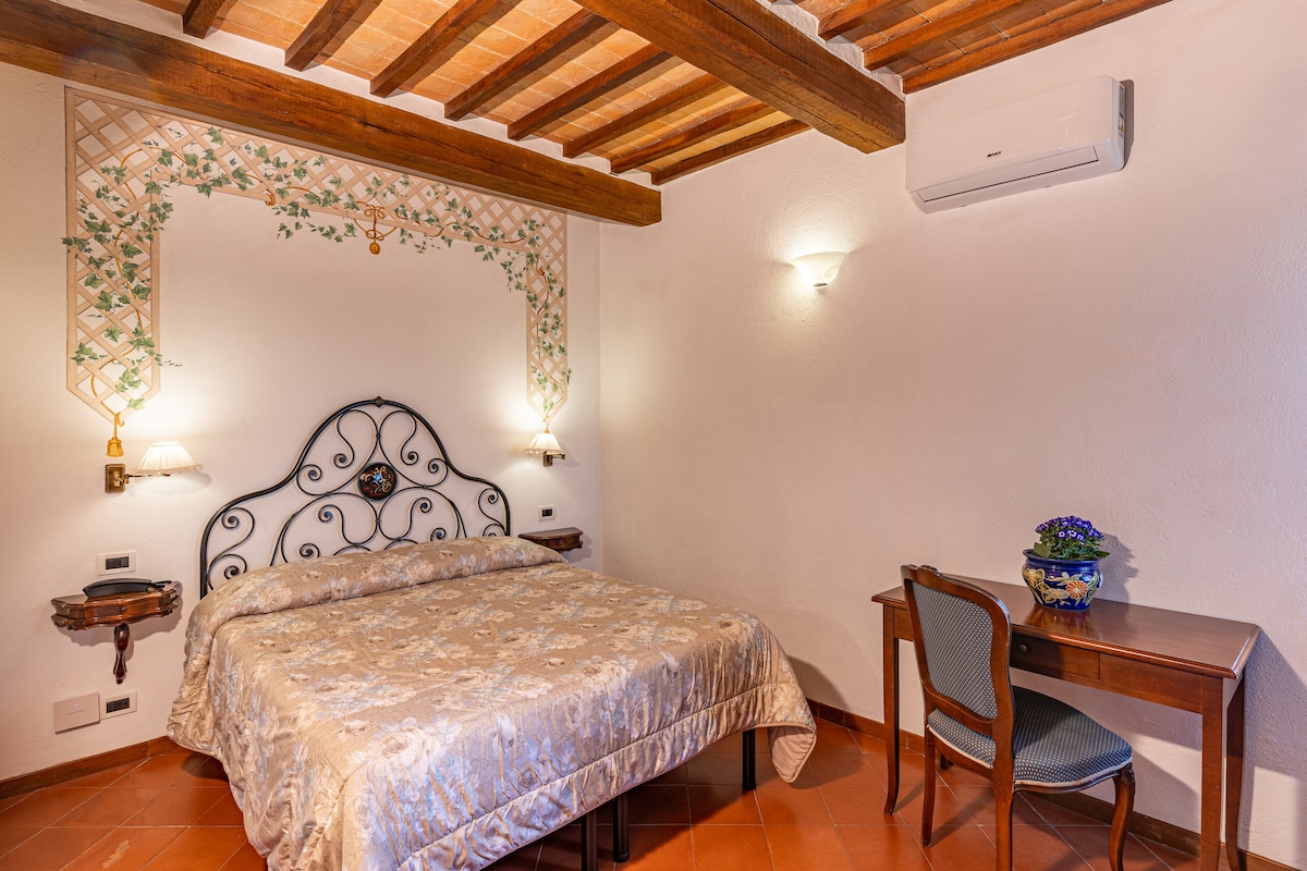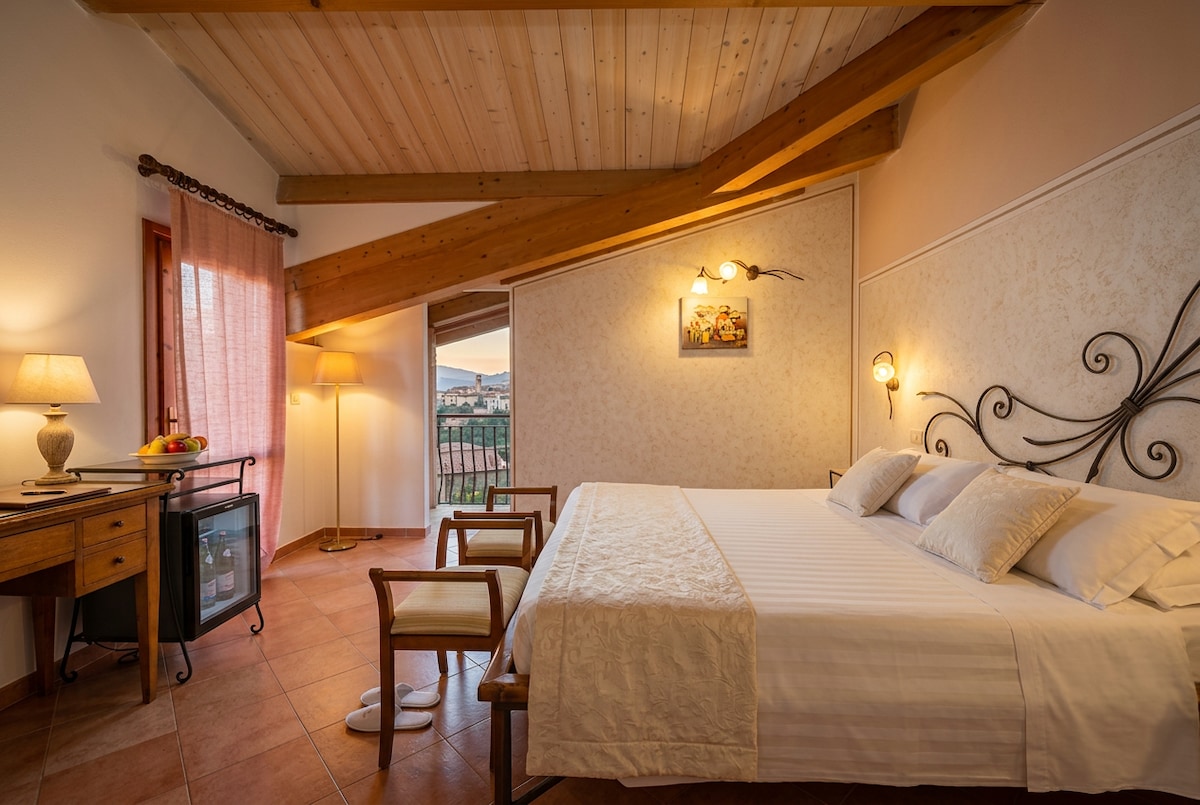 Wake up enjoying the slow village life. Staying in a deluxe double room with a king-size bed. Furnished with modern design but keeping intact the characteristics of the context. Parquet, air conditioning, WiFi, satellite TV, private bathroom, electronic lock, safe, refrigerator.