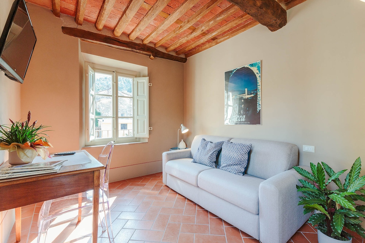 We are delighted to invite you to our ancient, and completely renovated, "Il Gallo" (the rooster) Bed and Breakfast in the Tuscan hillside above the walled Roman town of Lucca. After a 15 minute drive up from Lucca you will find yourselves surrounded by olive groves with stunning views out over the mountainsides and valleys. Your room After leaving your car in the shade of the olive trees, after just a few steps you will be at the private entrance to your romantic bedroom with lovely views from every window - even from the shower! There is an en-suite bathroom complete with toiletteries and hairdryer. There is a small pantry with a fridge, microwave, kettle and necessities to prepare a picknick and/or aperitivo to be enjoyed on your terrace. Ceiling fan for hot summer nights!