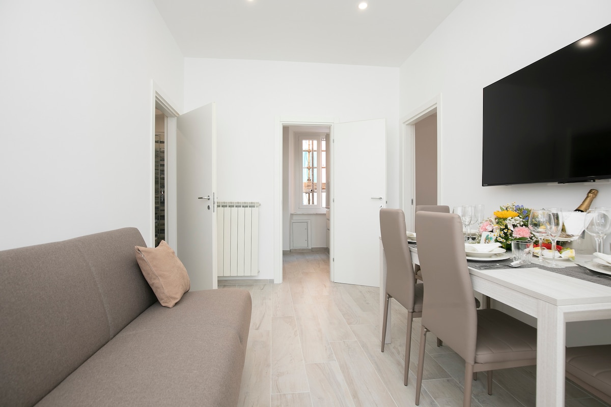 Seafront Apartment in Spotorno, a few steps from the beach. In a historic building in Spotorno, called Hotel Palace, it offers common areas, a glassed-in hall overlooking the sea equipped with tables and armchairs for study, work or relaxation, a gym with pingpong table and a well-kept garden at the entrance to the building. Furthermore, there is a caretaker in the building, with guardianship duties. The apartment is equipped with a garage directly in the building. CIN code: IT009057C2FHHXACCZ