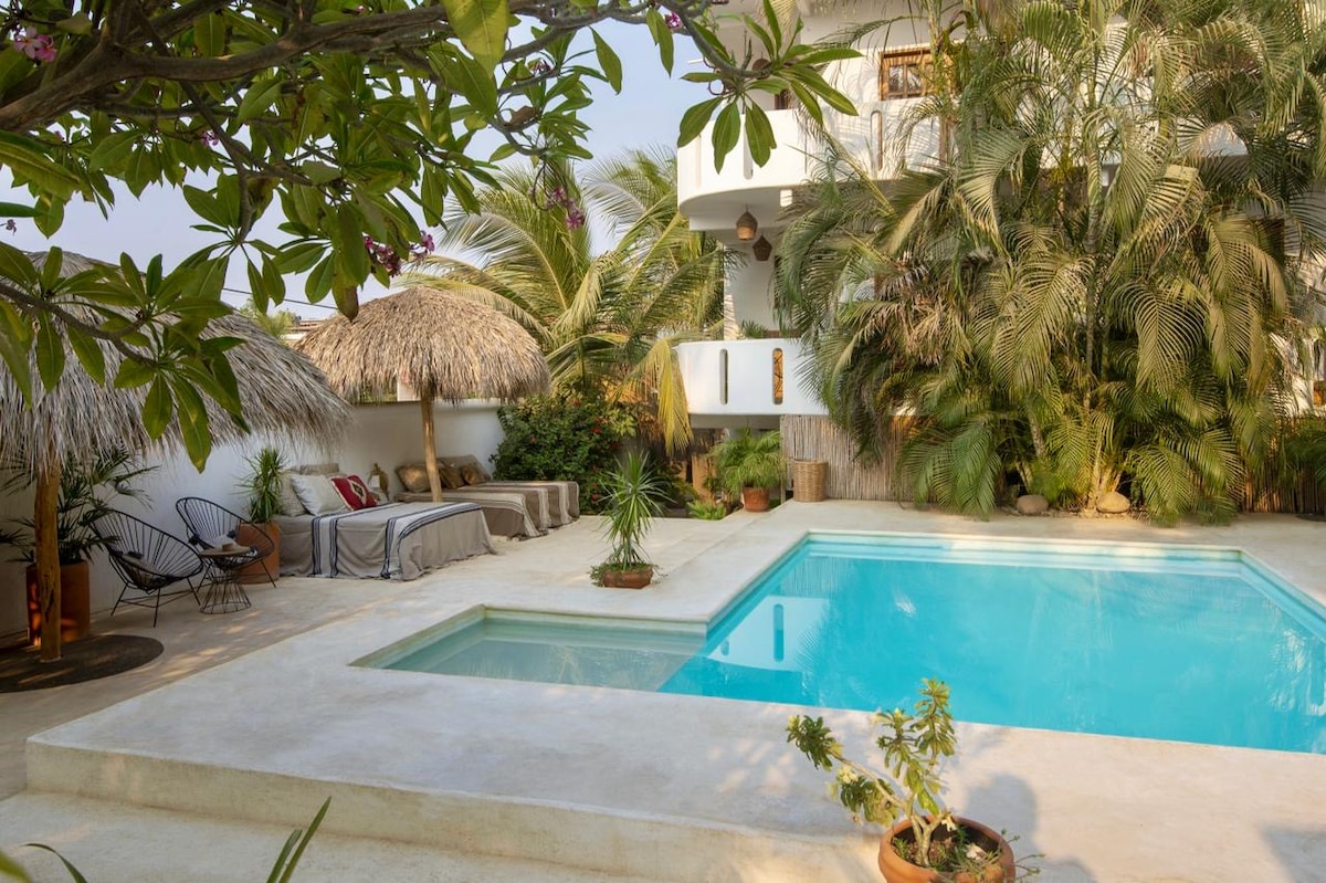 Recently feat in Condé Nast Traveler "35 Airbnbs With Amazing Pools" @casahezbo is one of four of this unique design, premium amenities, high-speed Starlink internet, best of Puerto Escondido on your doorstep. Located in La Punta, 5 min walk to the beach, restaurants, bars, & coffeeshops. Two bedrooms (king & queen), two full baths, a full kitchen, living area, dining area, & pool in a unique indoor-outdoor design. Bedrooms include shutters, are fully enclose-able, include AC & ceiling fans.