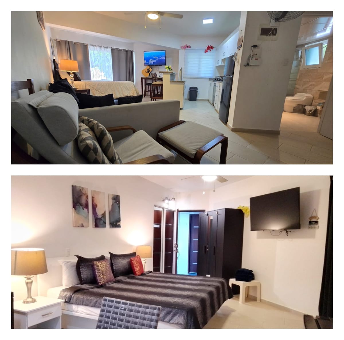 •Penthouse apartment on the beach strip in the heart of the City of Cabarete on GROUND FLOOR. •One new queen size bed, one new queen size sofa pull bed in living room with attached kitchen and bathroom. •Second bedroom with King size bed and attached bathroom and kitchenette for extra couple. •Photos are accurate not staged. •Free parking. •Free one hour massage or two hour paddle board rental or manicure/pedicure included two times every week during your stay on the premises for two people.