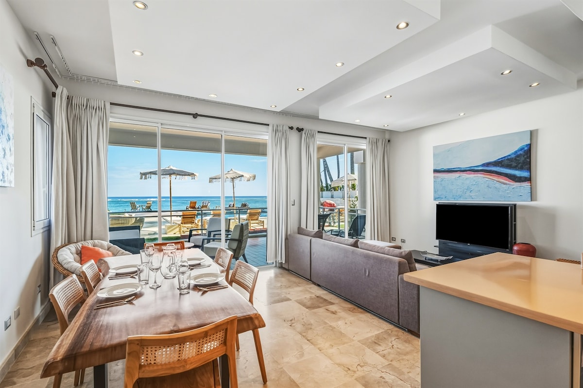 Escape to this NEW Luxurious and Modern Beachfront Condo on Playa Dorada Puerto Plata, Dominican Republic. All needed to enjoy a pleasant, peaceful and safe stay; with direct access to the beach, the double terrace that leads you to the swimming pool, a gazebo and gym; accessible upscale golf campus, restaurants inside the complex, close to shopping center, the international airport, and many attractions like water park, cable cars, historic center, nightclubs and more.