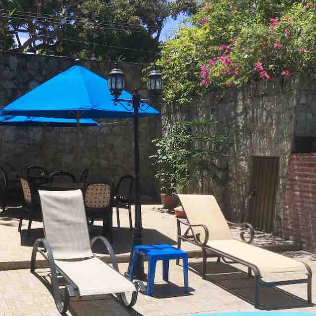 Room with en-suite bathroom within a quiet, small family style hotel. This room is ideal for digital nomads, retirees and students. Furnished with one double bed, one single bed, lounge chair, ceiling fan and small refrigerator. The porch overlooking the pool and gardens has a table and 2 chairs. Fast, fiber optic internet. There is a communal kitchen and small dining area available for guest use. An American style breakfast is available at additional cost. No A/C.