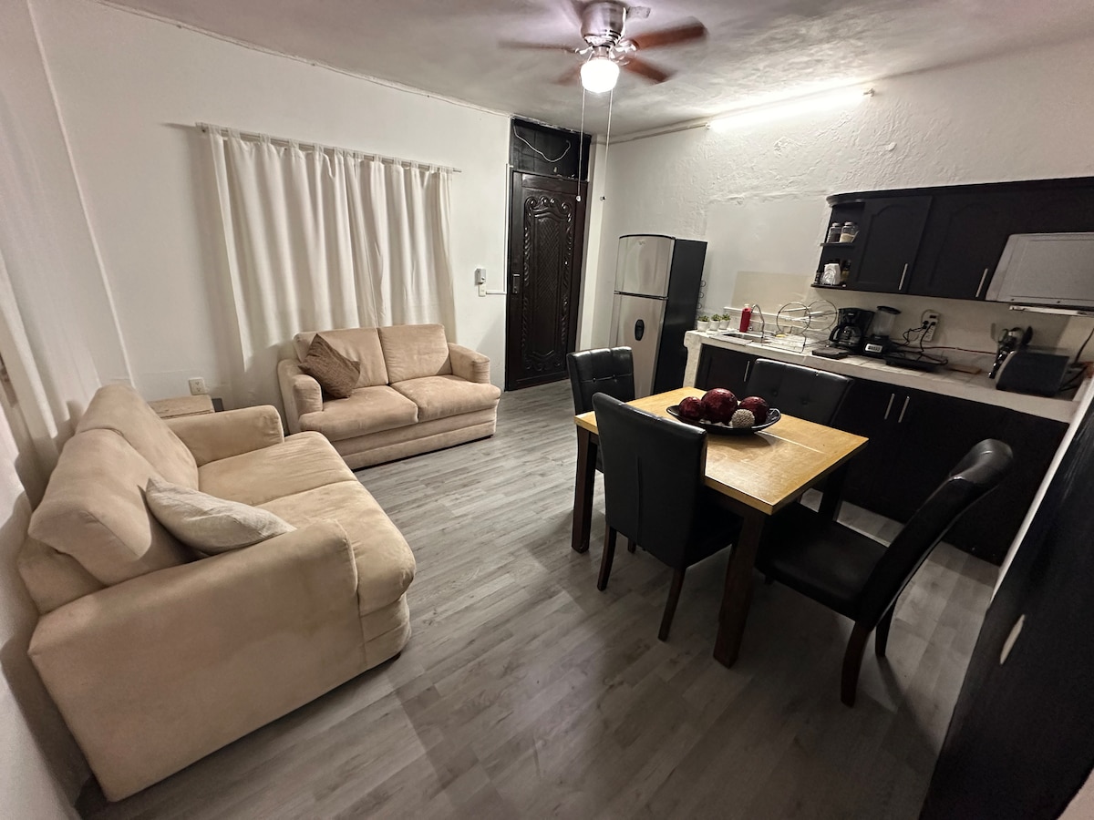 Modern and cozy apartment decorated and equipped with every detail in mind, with a small balcony, with lots of sunlight and ventilation, surrounded by restaurants, cafes, shopping centers, banks and more; in a very safe and quiet. 1 block from the main access avenue to Puerto Vallarta, with accessible transportation just 1 block away. Ideal space to enjoy with your family, spend a season doing home office, a business trip or a weekend ... you will have a great time