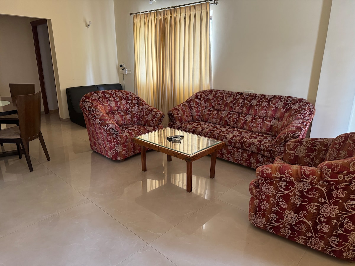 A cozy 1000 sqr ft. 1BHK The place is very quiet and calm. The house has following features : - Full kitchen with Gas stove, induction, microwave, refrigerator and utensils - Washing machine. Outdoor hanger to dry clothes. - Private garden - 32' TV, Fire TV with premium accounts for Netflix,Prime Video, SonyLiv, Zee5 - 24 Hour solar hot water - Inverter A/C - Wifi 100 mbps Tata fiber internet Enjoy the walk around the garden and the society.