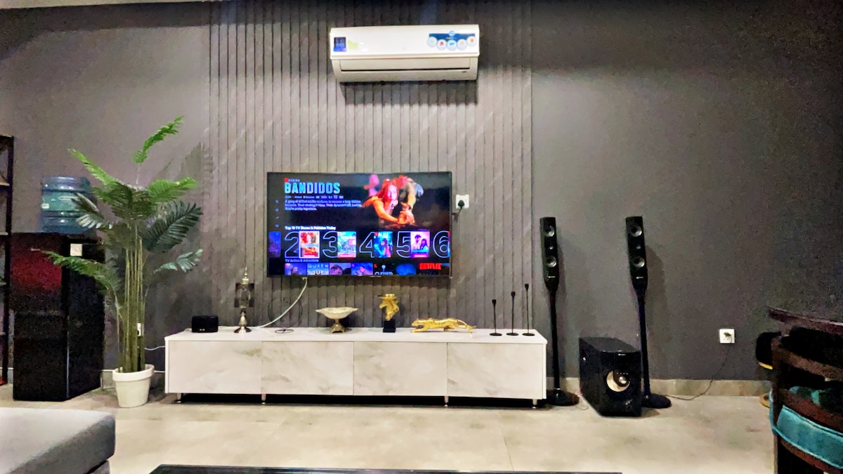 Our 1 BR condo in DHA Phase 5 is where urban chic meets celestial cool. Think: a glowing moon wall for those late-night selfies and a bold dollar-stacked art piece that screams "main character energy" Wake up to park views from your private balcony swing, binge your faves on the 50" 4K Smart TV, or cook up something aesthetic in the fully loaded designer kitchen. The interiors? Abstract, stylish, and made for the feed. Plus, you're right next to Lahore's hottest dining spots.