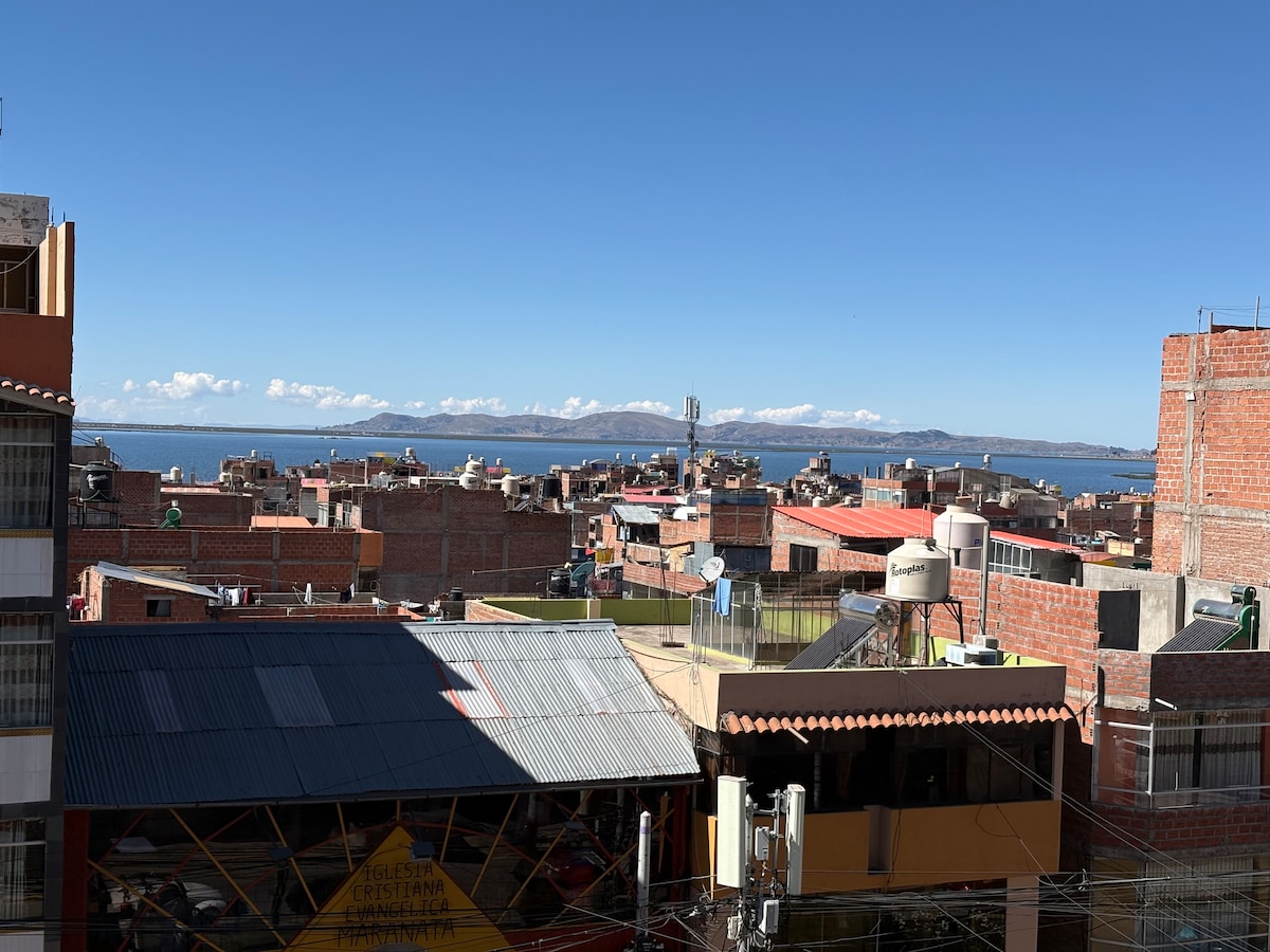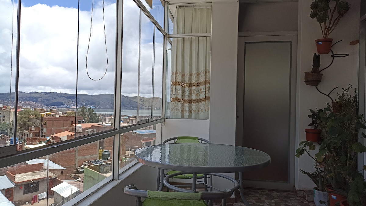 Departamento, a 2 CUADRAS DE NUESTRO LAGO TITICACA, LA PLAZA, la casa esta ubicada hacia la calle, en el segundo piso de la avenida principal de nuestra ciudad, son ambientes, acogedores y sobre todo seguros, con vista al lago y a la ciudad desde la sotea de la casa, te ofrecemos cable y wifi durante tu estadía. se encuentra cerca a los principales lugares turísticos de nuestra ciudad, lugares a los que puedes acceder caminando, contamos con cámaras de seguridad.