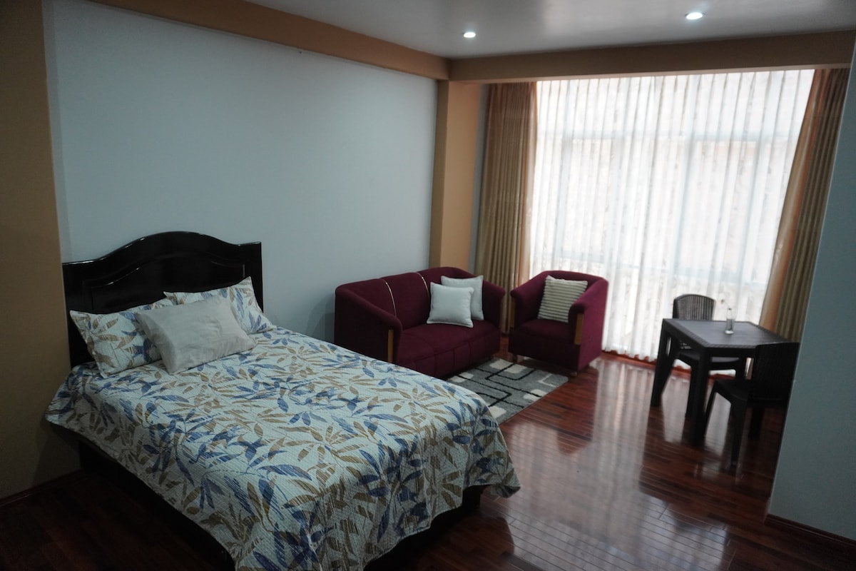 ¡La vista te impresionará y disfrutarás de un ambiente privado y luminoso! ❇️ Sala de estar con smart TV ❇️ Estación de té con hervidora, termo, microondas y vajilla. ❇️ 1 cama matrimonial ❇️ Ducha independiente y privada. ❇️ Baño independiente y privado. ❇️ Garaje privado (con pago adicional) La zona es segura y podrás visitar un mercado tradicional, ¡ven y sumérgete en la cultura de Puno!