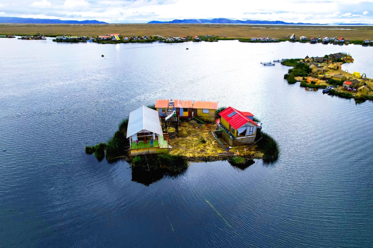 Son cabañas suites el lugar es único y exclusivo el paisaje que lo rodea es asombroso la vista desde la cabaña es mágico los atardeceres, la isla es privada alrededor se puede observar la fauna, mucha paz y tranquilidad la cabaña cuenta con todos los servicios A1. Ven y vive la experiencia de estar en una isla flotante en medio de lago Titicaca