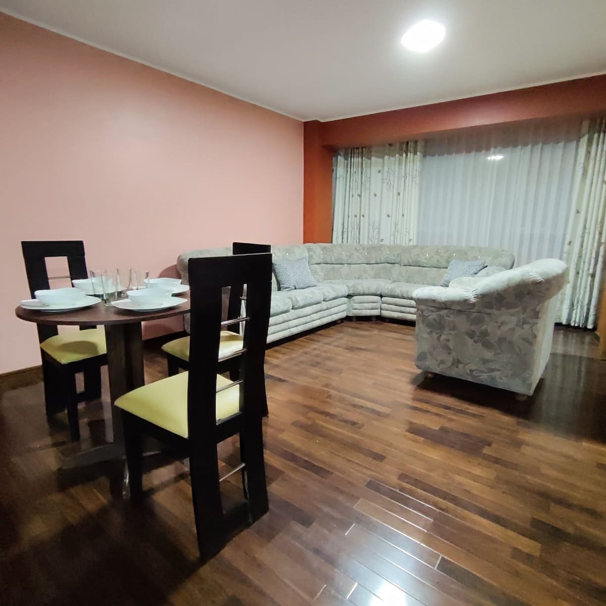 Departamento con dos habitaciones, sala, comedor y cocina equipada con lo necesario para preparar y cocinar alimentos. Muy cómodo, espacioso y tranquilo. Contamos con cochera dentro de las instalaciones. Tenemos Wifi y televisión por cable. Está ubicado cerca al mercado Laykakota, parques, restaurantes, terminales y farmacias. La zona es tranquila, pasan muchas empresas de transporte urbano, taxis y mototaxis. Desconecta de tus preocupaciones en este espacio tan amplio y sereno.