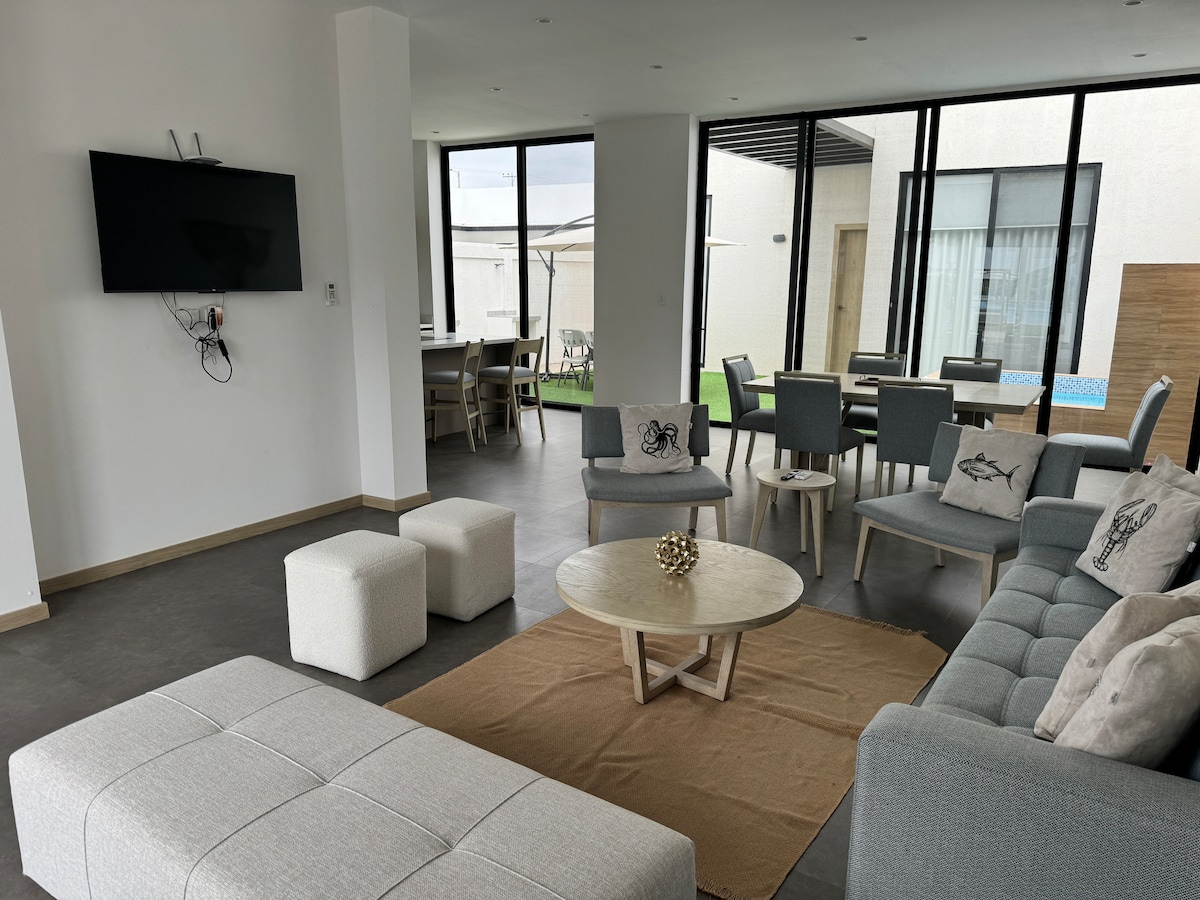 Departamento de planta baja, en el Condominio TownHouse amoblado, se encuentra dentro de una urbanización privada, seguridad 24 horas, circuito cerrado, ofrece sin ningun recargo acceso al club privado Punta Centinela, playa Privada, restaurante, piscina, jacuzzi, area de juegos infantiles, cuenta con instalaciones para deportes acuaticos, es importante considerar que todos los lunes y martes el club entra a mantenimiento y por el mes de Agosto 2025 el restaurante no funcionara por remodelaci