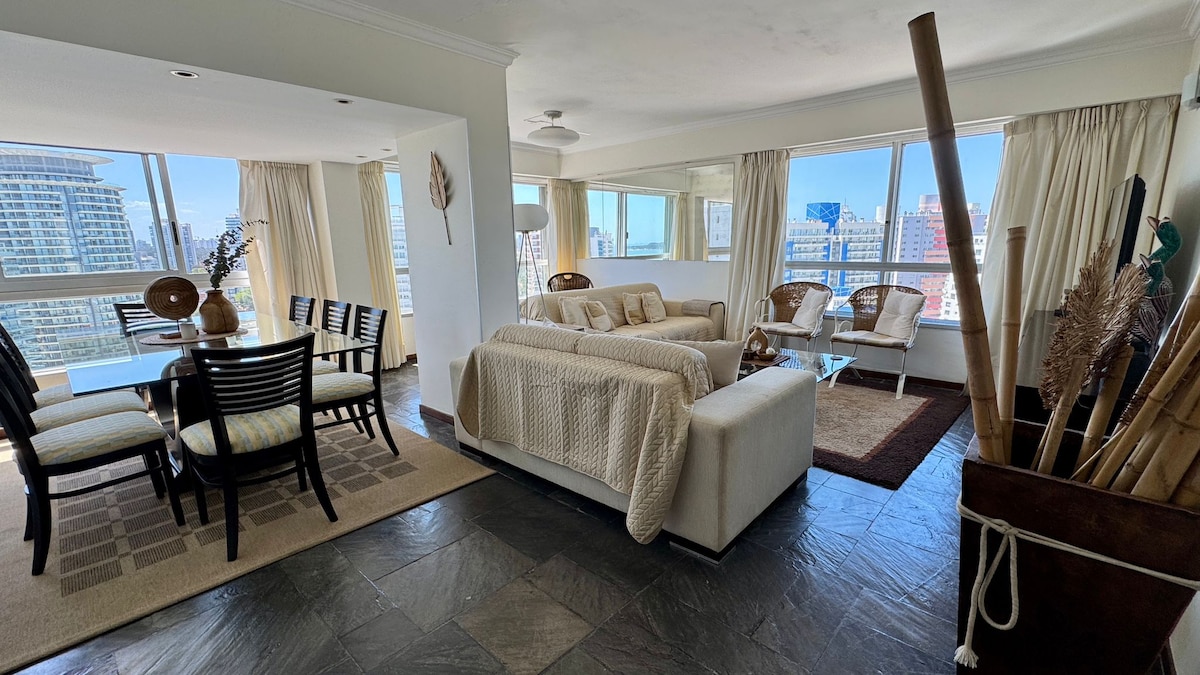 Este increíble apartamento con vista hacia playa mansa desde el piso 16 cuenta con cochera cubierta, piscina interior y exterior climatizada todo el año, gimnasio, sauna, parrilla, servicio de limpieza, cine, salón de juegos. Ambas Tv Smart, Solo Netflix, Youtube, Disney, etc. Ubicado en la mejor zona de PDE, rodeado de comercios, supermercados, bares y restaurantes abiertos todo el año. Queda en la conocida torre Place lafayette, a 100 metros del Punta Shopping y a 300 metros del mar.