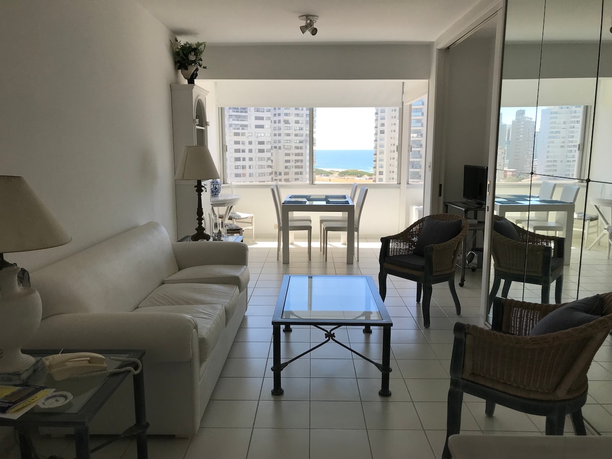 Apartamento frente a la mejor playa de Punta. Parada 3 playa Brava. Totalmente equipado para disfrutar de unas vacaciones inolvidables!!! 2 dormitorios (uno con cama matrimonial y el otro con 2 camas de 1 plaza), 2 baños completos (1 en suite), living comedor, cocina, lavadero y garaje. Aire acondicionado y tv en todos los ambientes. Piscina climatizada (solo en verano), parrilleros, salón de uso múltiples, gimnasio, jacuzzi, sala de juegos. Con servicio de mucama (limpieza) diario.