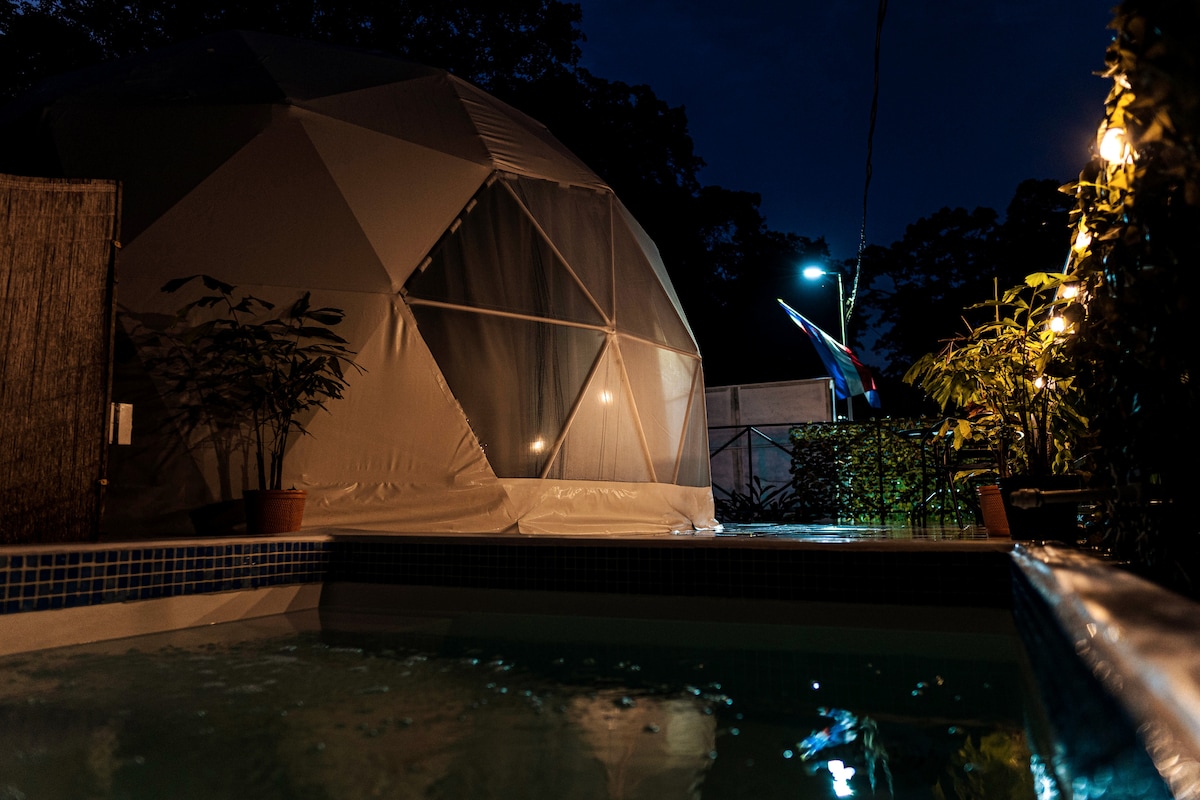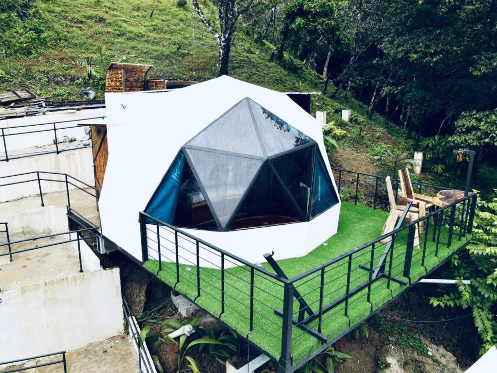 Glamping Dome surrounded by nature & wildlife with panoramic mountain & ocean views. ● The areas: ☆ Parking ☆ Hammocks area ☆ Tiny pool under the trees. ☆ 1st floor terrace with kitchen, bathroom & dome ☆ 2nd floor terrace with panoramic views ● Descripción: A fully equipped kitchen with an outdoor barbecue, bathroom with rain shower & hot water, air-conditioned room, tiny pool under the trees, area with hammocks to relax, terrace with panoramic view, WIFI, private parking & security cameras.