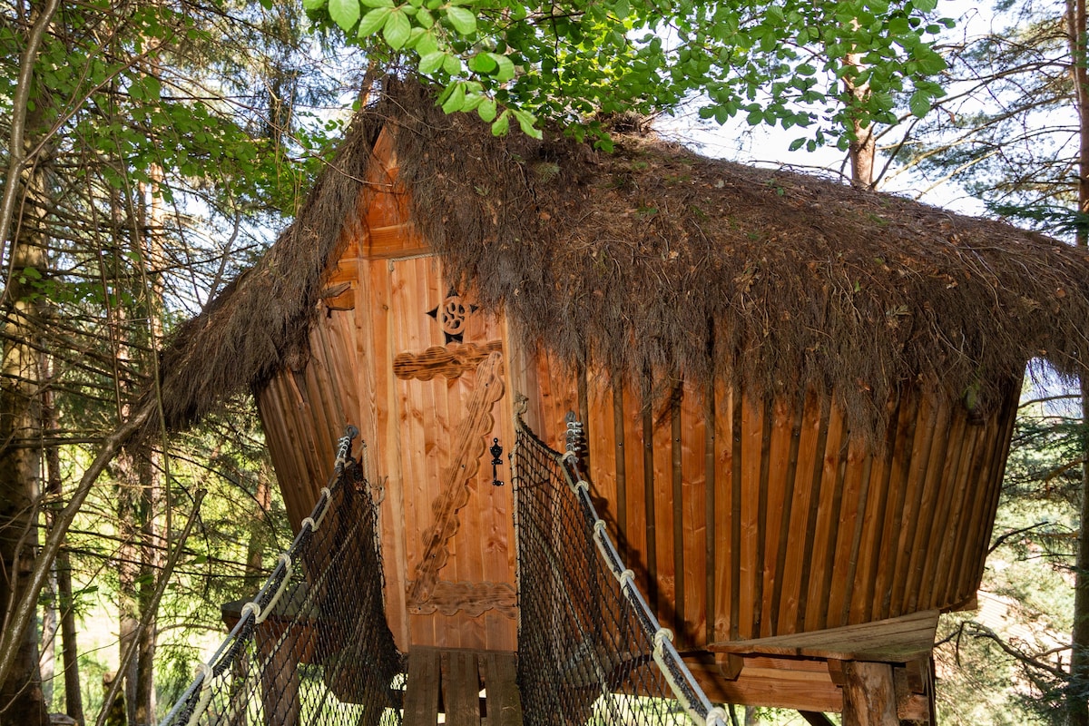 Cabane perchée sur pilotis au coeur de la forêt pour un dépaysement total. Accès par une passerelle semi-rigide. La cabane n'a ni eau ni électricité ni chauffage. La terrasse couverte vous permettra de prendre votre petit déjeuner ou votre panier repas et de profiter du bon air par tout les temps.
