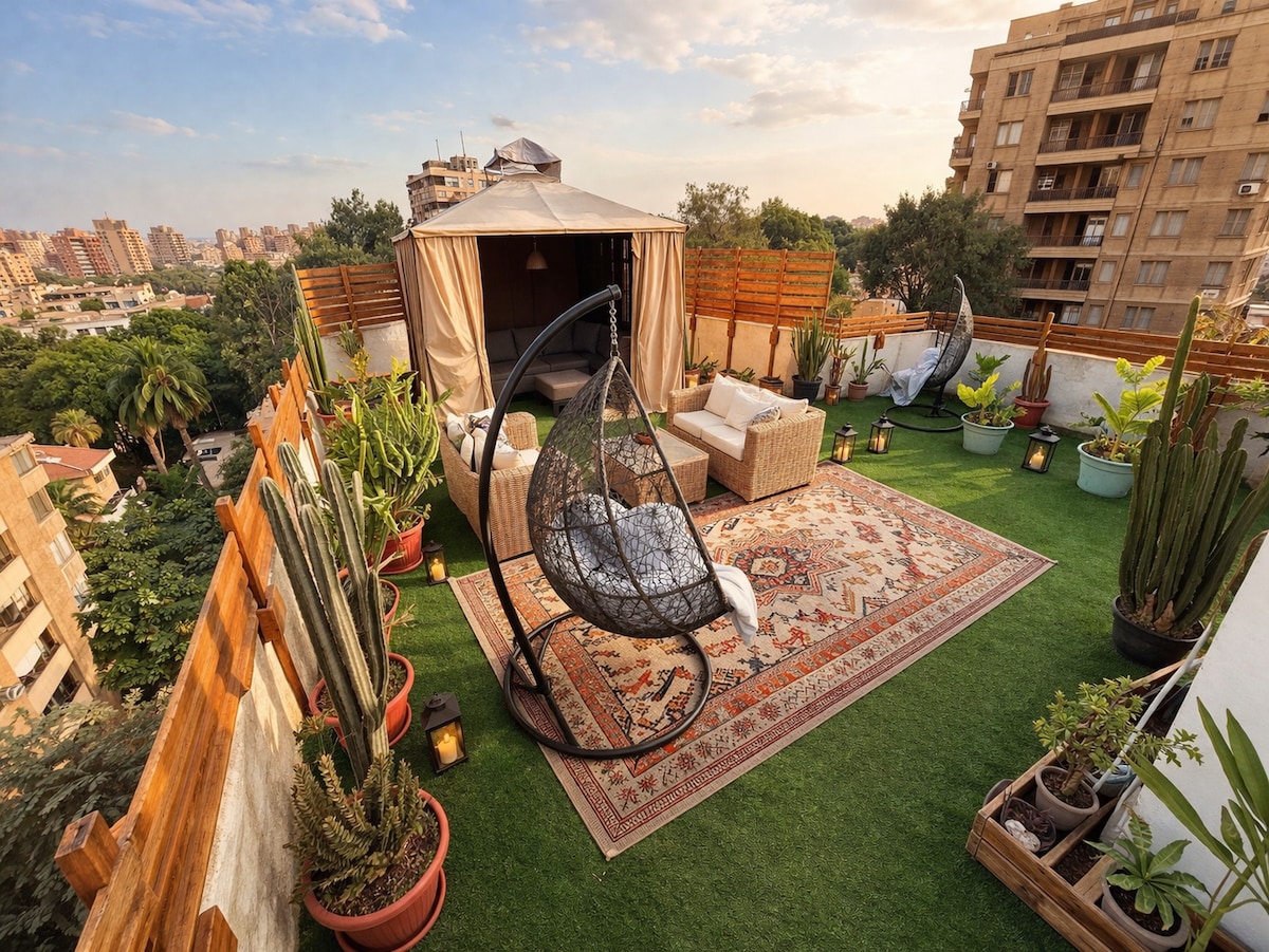 Welcome to our Nileview loft, Your charming home in the heart of Zamalek Island, Cairo's most central, safe, and vibrant hub. The stylish living room boasts a 55-inch curved smart TV and panoramic views on the Nile. A boho living room with a bamboo swing overlooks a gorgeous Nile view. Two cozy bedrooms featuring memory foam mattresses, hotel-grade Egyptian cotton beddings. Relax in comfort and style with a touch of bohemian charm by the Nile."
